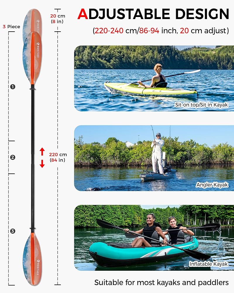Adjustable Kayak Paddles --- 20 cm adjustment to meet more length needs, total length is 86-94" (220-240 cm), total weight is 1.98 lb (0.9 kg), suitable for most kayaks and paddlers