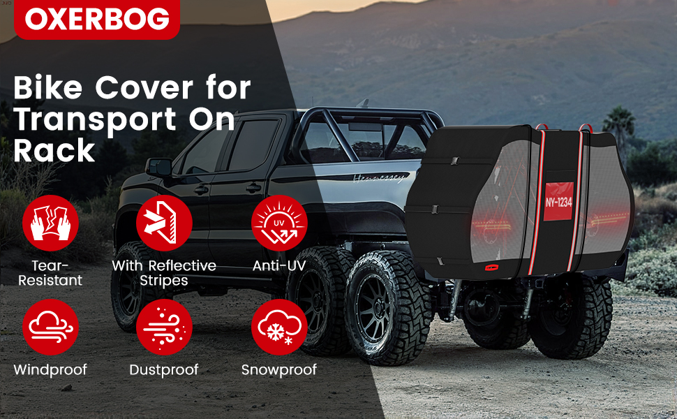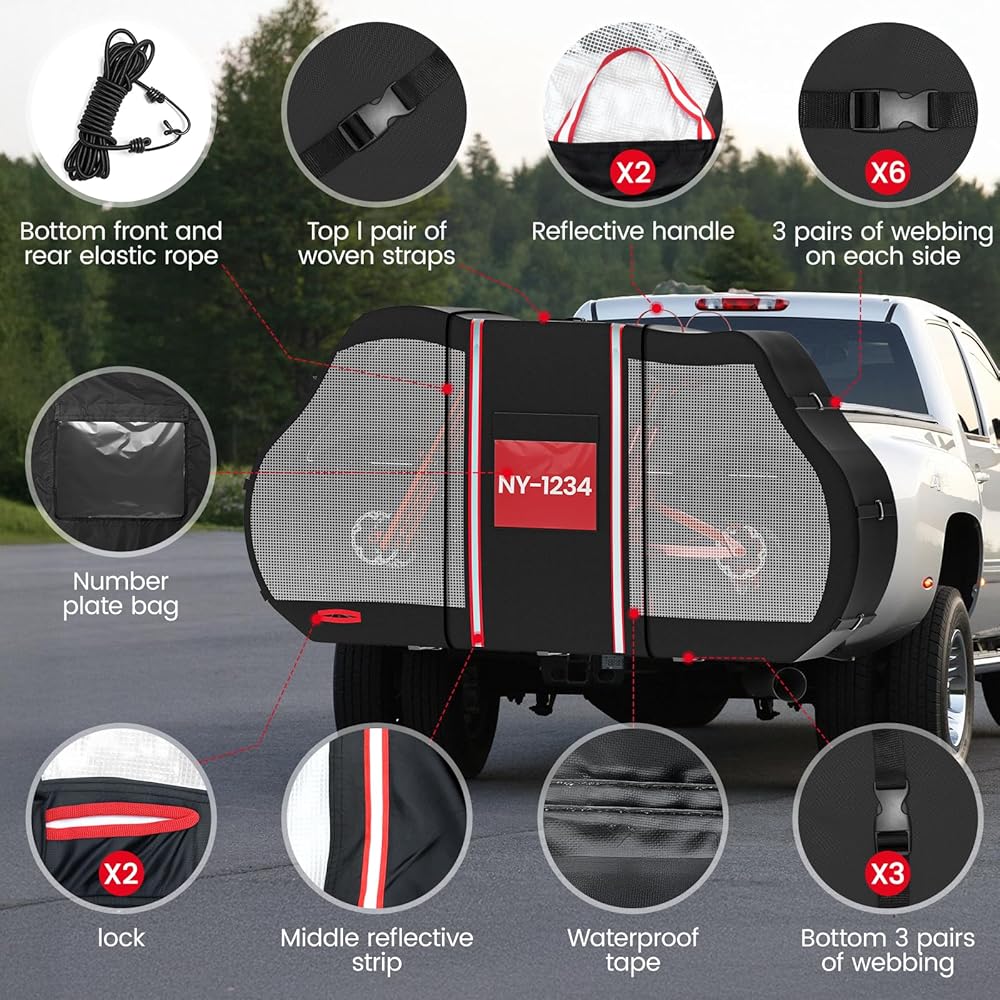 Safer Desing: The outdoor bike cover is made of reinforced Clear PVC panels and reflective strip to ensure that your car taillights are clearly visible, If the cover obstructs the license plate, you can insert the license plate through the transparent license plate window.Safe driving at night,thus ensuring safe transportation and safety for both you and the driver behind you.