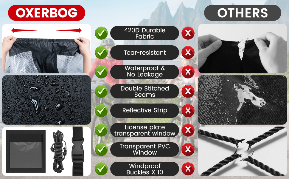 420D Waterproof: Made of Premium 420-Density oxford cloth with PU coating, bike covers for transport on rack are extremely heavy-duty and super waterproof. Compared with PVC-type covers, our bicycle transport covers are more durable and hard to be torn after every long-distance travel.No more worry about the sunlight, rain, snow, wind, dust, resin, leaves, debris and bird droppings etc.