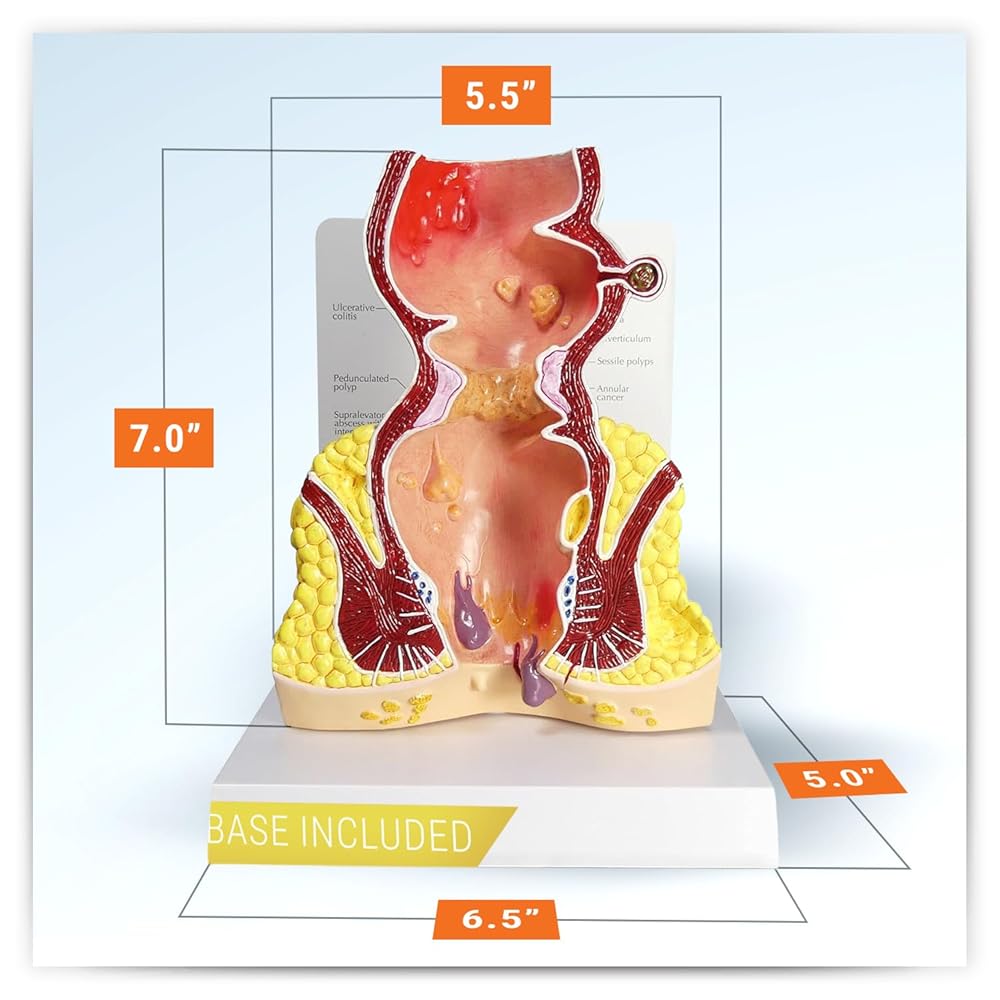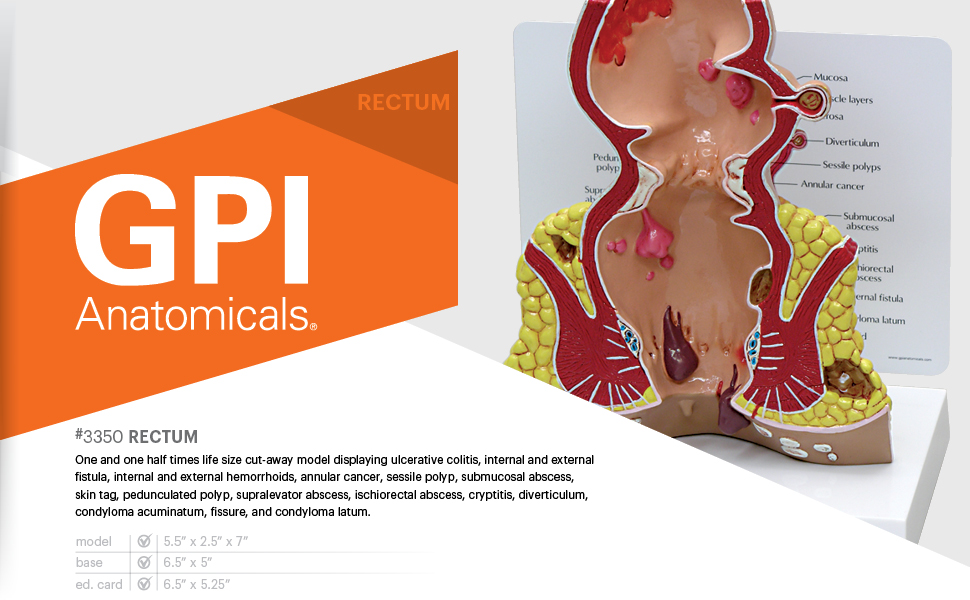 Rectum Model: GPI Anatomicals presents an oversized cut-away anatomy model depicting the rectum. A great substitute for anatomy posters, the model shows conditions like ulcerative colitis, diverticulum, cryptitis, annular cancer, and ischiorectal abscess