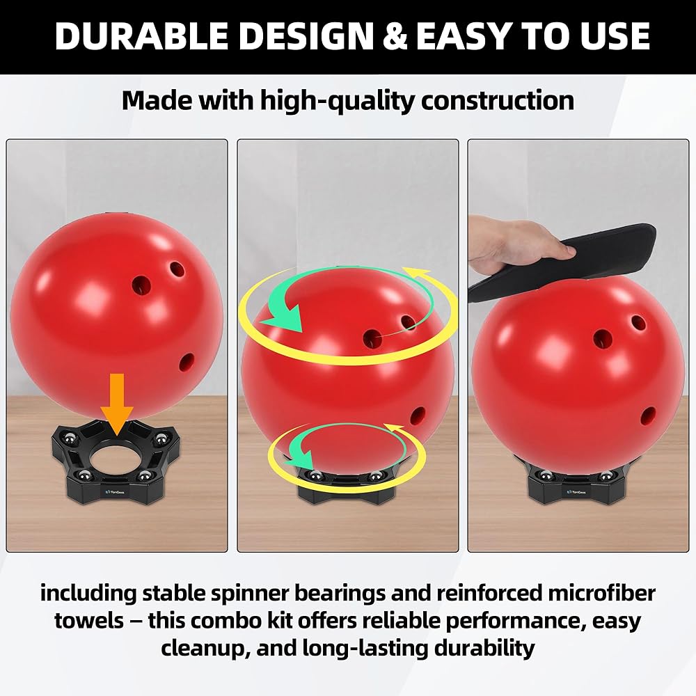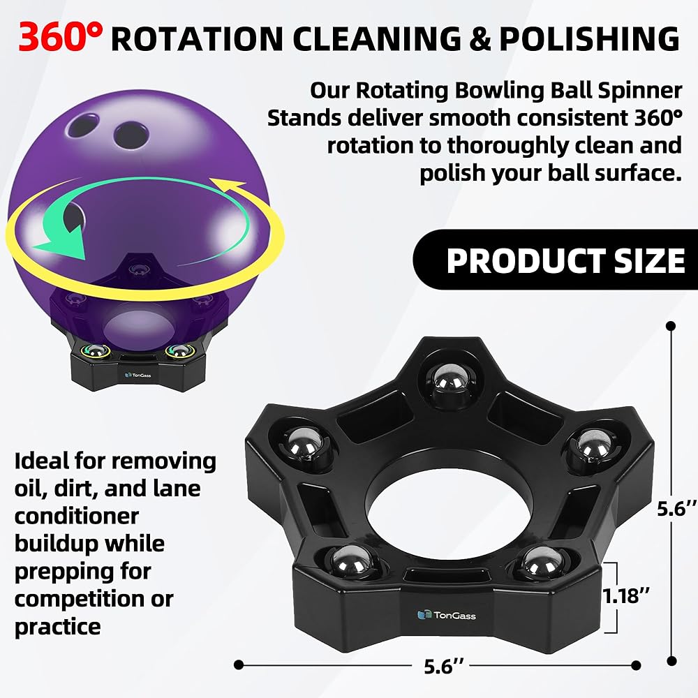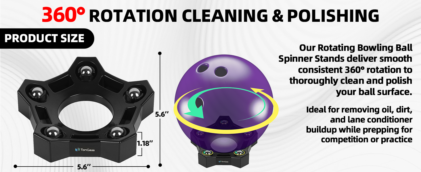 360° ROTATION CLEANING & POLISHING — Our Rotating Bowling Ball Spinner Stands deliver smooth consistent 360° rotation to thoroughly clean and polish your ball surface. Ideal for removing oil, dirt, and lane conditioner buildup while prepping for competition or practice