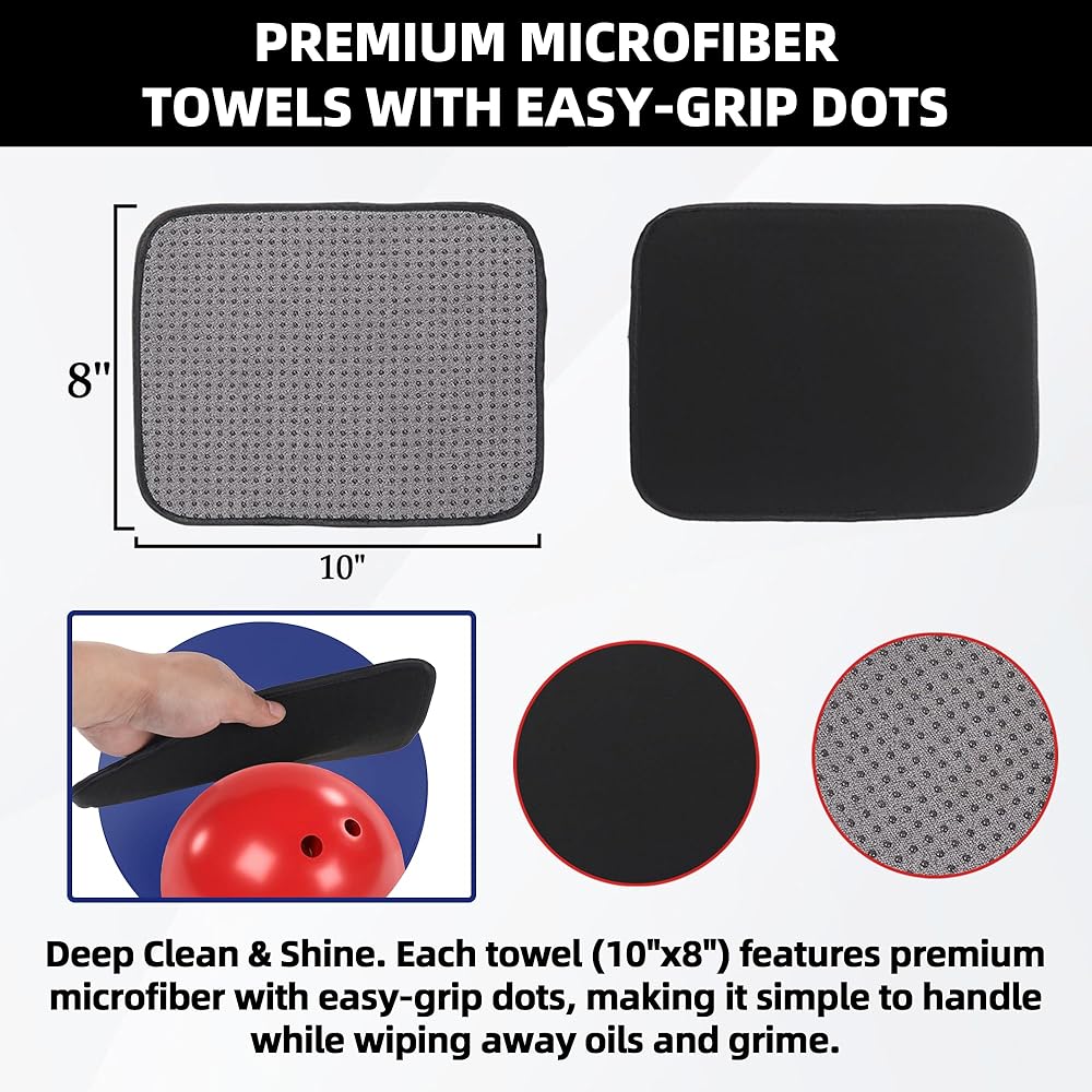 PREMIUM MICROFIBER TOWELS WITH EASY‑GRIP DOTS — Deep Clean & Shine. Each towel (10"x8") features premium microfiber with easy‑grip dots, making it simple to handle while wiping away oils and grime. Works on all bowling ball covers tocks for improved traction and responsiveness