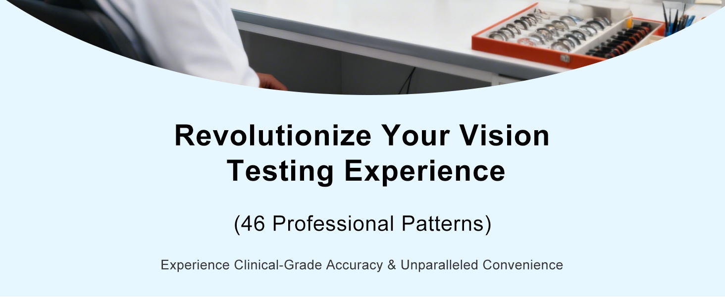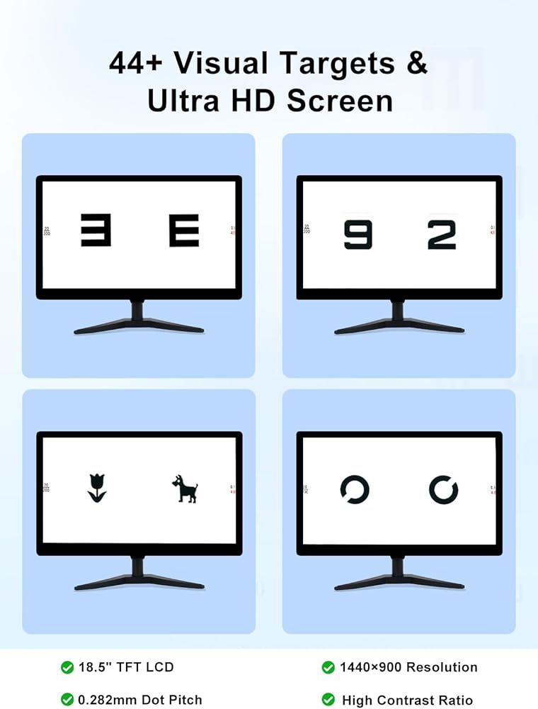 44+ Visual Targets & Auto Play: With over 44 calibrated visual targets including E, C, letters, numbers, and children's patterns, this electronic optical vision meter enables thorough vision evaluation. The auto-play feature automates sequential testing, enhancing efficiency for both clinical and home use