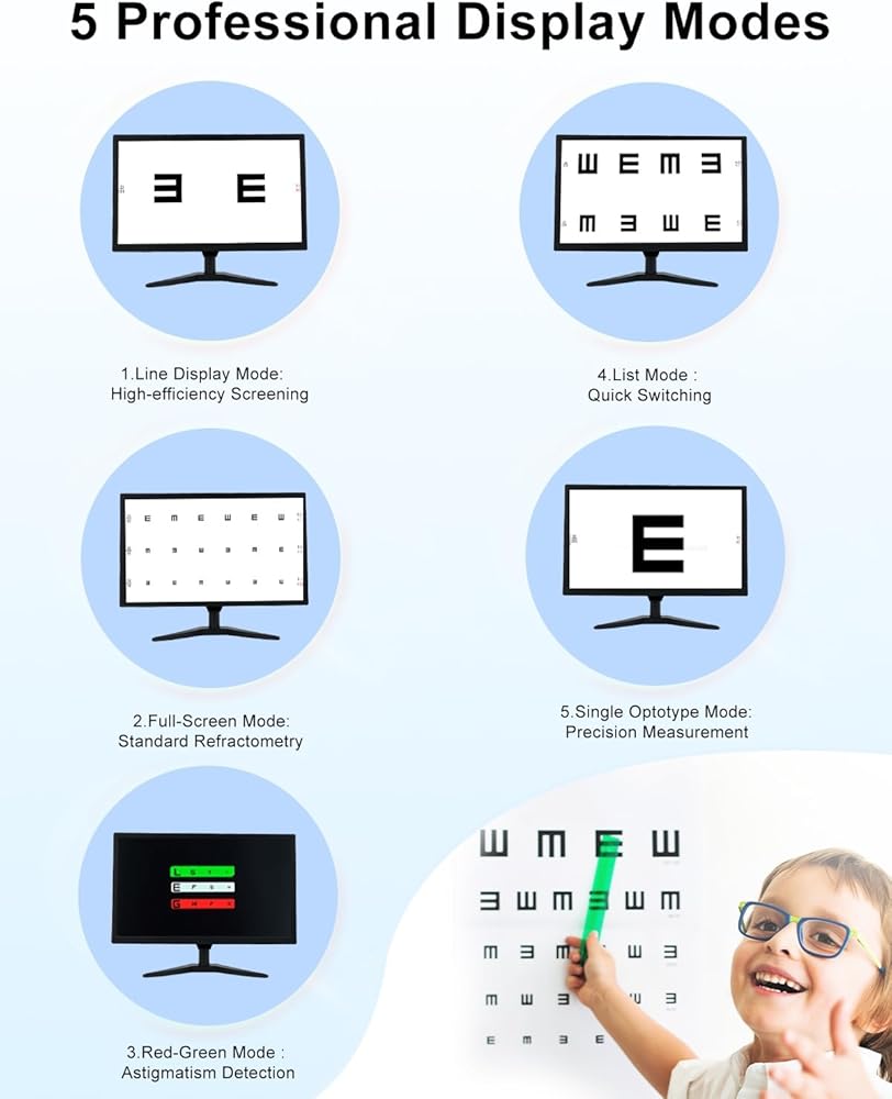 5 Flexible Display Modes: This visual acuity chart digital supports five display methods: single optotype, full-screen, red-green contrast, list view, and line display. Switch seamlessly via remote control to accommodate diverse optometry needs, from basic acuity checks to astigmatism and color vision assessment