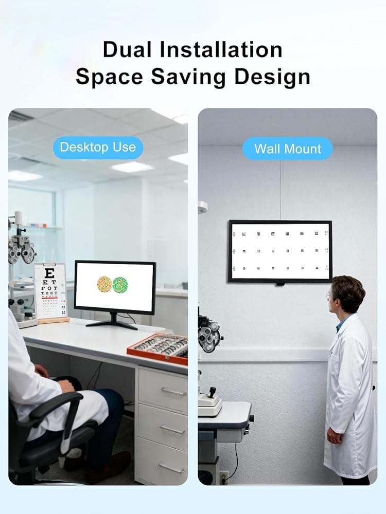 Dual Installation Options: Designed for versatility, this optical elite digital visual acuity eye chart supports wall-mounting (with reinforced brackets) and flat-seat installation (anti-dropping pin included). The slim profile (0.79in thickness) and lightweight build (5kg) save space in clinics, optical shops, or homes