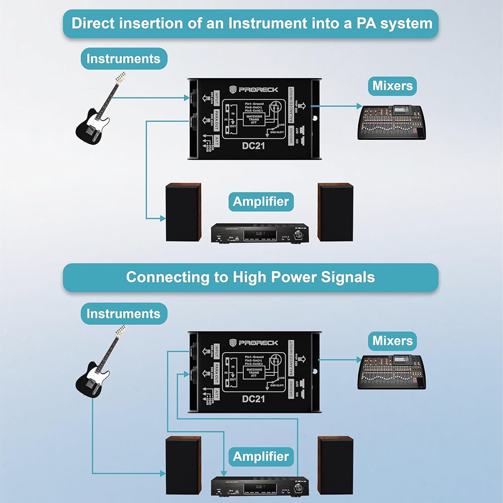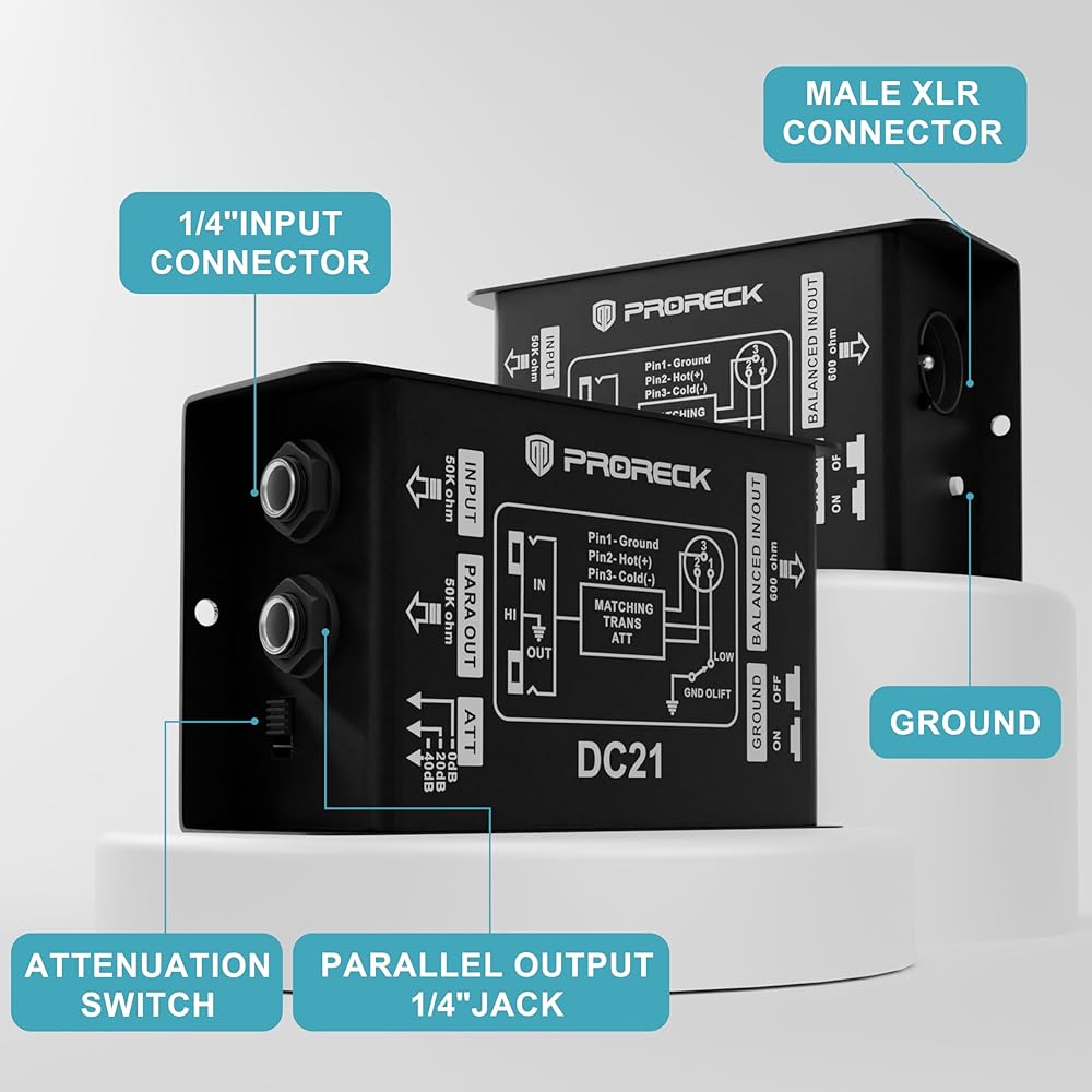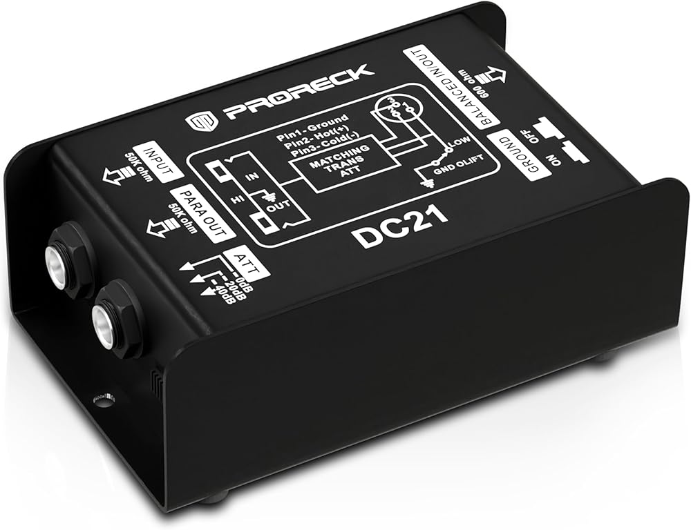 PRORECK DC21 Passive DI Box for Guitar & Bass, Direct Box with Hum Eliminator, Input Attenuator, Ground Lift, 50kΩ Impedance, 1/4" to Balanced XLR Out for Live/Studio (DC21)