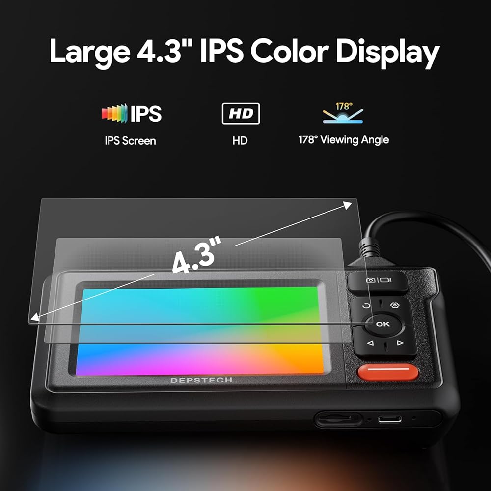 HIGH DEFINITION 4.3 INCH IPS DISPLAY: Enjoy crystal-clear, real-time footage directly on the borescope camera with no need for additional devices. This intuitive display facilitates quick, on-the-spot analysis, enabling you to make immediate, informed decisions during inspections