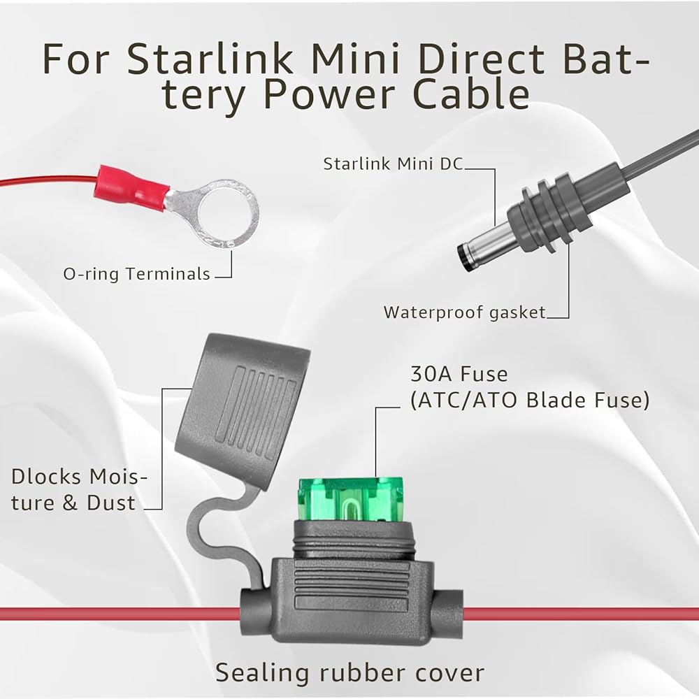 Easy To Use: Pre-attached O-ring terminals (+/- marked) and no tools needed. Universal compatibility with standard blade fuses and Starlink Mini's DC port