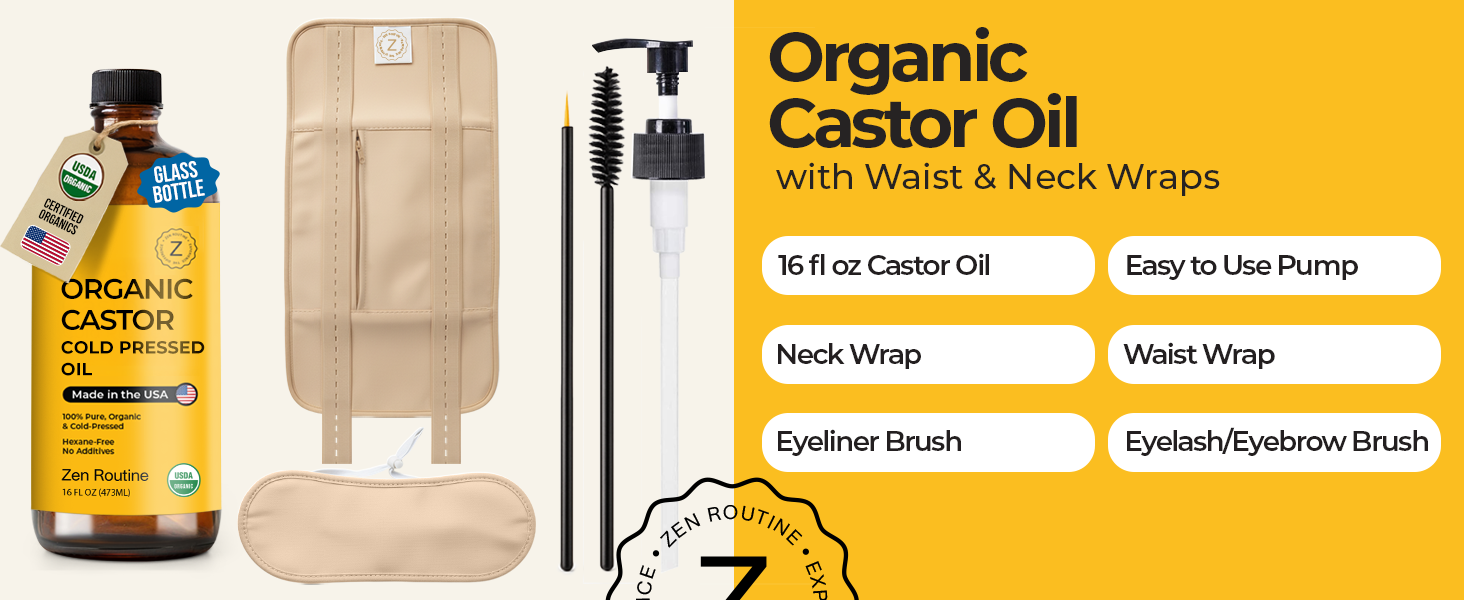 Zen Routine Castor Oil Pack Wrap + Glass Bottle Castor Oil 16oz Set — Organic Cold-Pressed, Hexane Free — Exceptionally Soft Reusable Wrap with Adjustable Straps — Made in USA