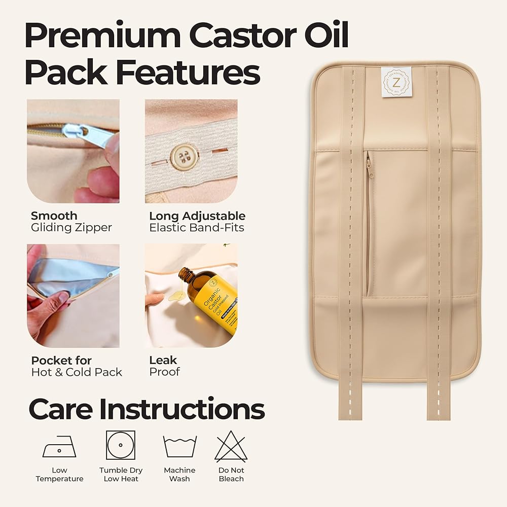COMPLETE 2-PACK SET: Enjoy 2 soft, cotton, adjustable wraps and a 16oz bottle of 100% pure, organic, hexane-free castor oil. Perfect for relaxation, castor oil face care, and overall wellness. Includes castro oil, castor oil organic cold pressed, and organic castor oil cold pressed glass bottle.