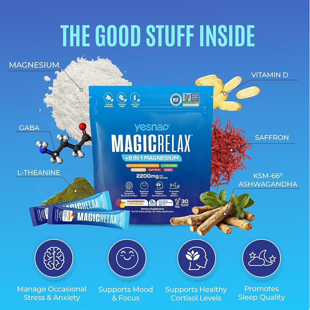 This 8-in-1 magnesium formula contains Magnesium Chelate, Magnesium Bisglycinate, Magnesium Malate, Magnesium Orotate, Magnesium Taurate, Magnesium Citrate, Magnesium Glycinate, and Magnesium Aspartate. It also includes KSM-66 Ashwagandha, Saffron extract, D3, GABA, and L-Theanine. Supports Healthy.