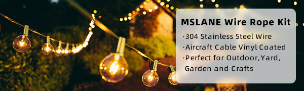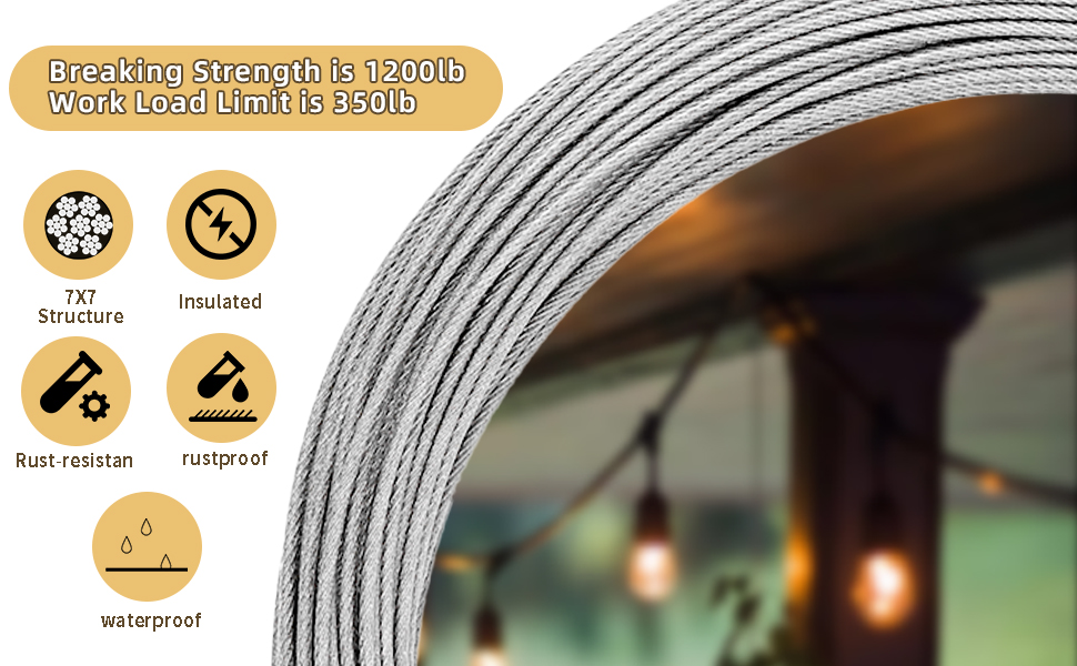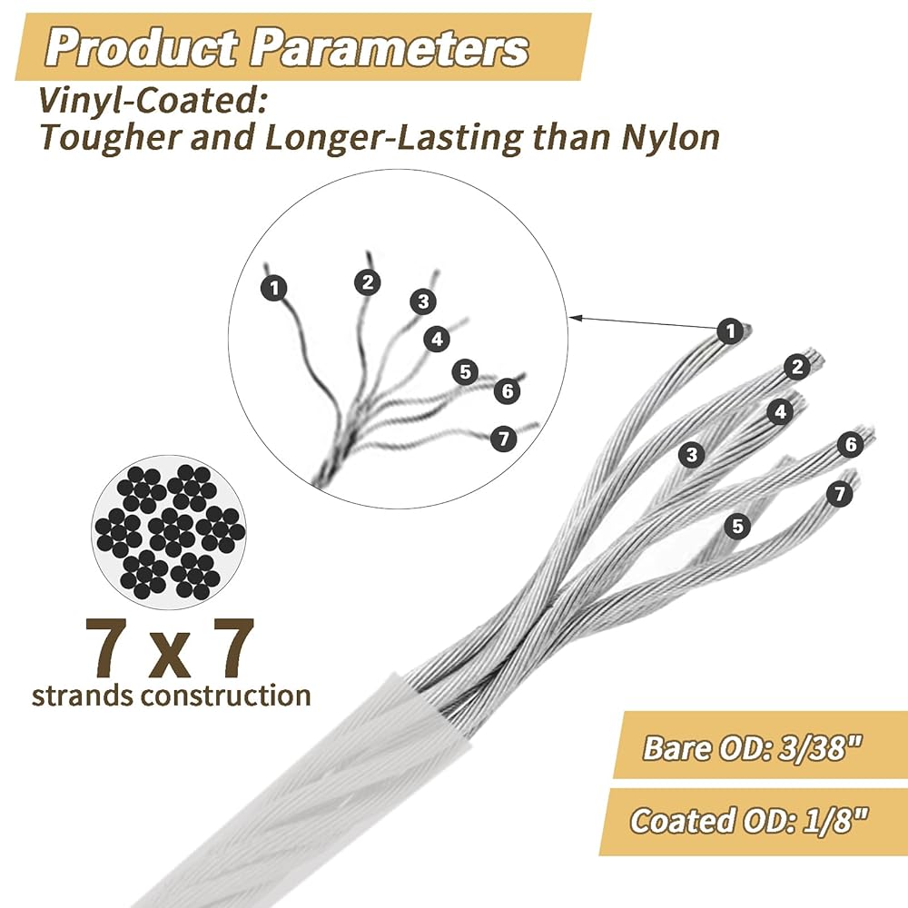 Sturdy String Light Hanging Kit:The stainless steel cable bare OD is 3/38 inch, coated OD is 1/8 inch. Made of high-quality 304 stainless steel, featuring strong anti-corrosion and anti-rust properties. The 7x7 structure means the steel cable is braided from 49 strands of steel wire rope. Once the cable is tightened, it is strong enough to hang heavy string lights in spacious open areas without sagging