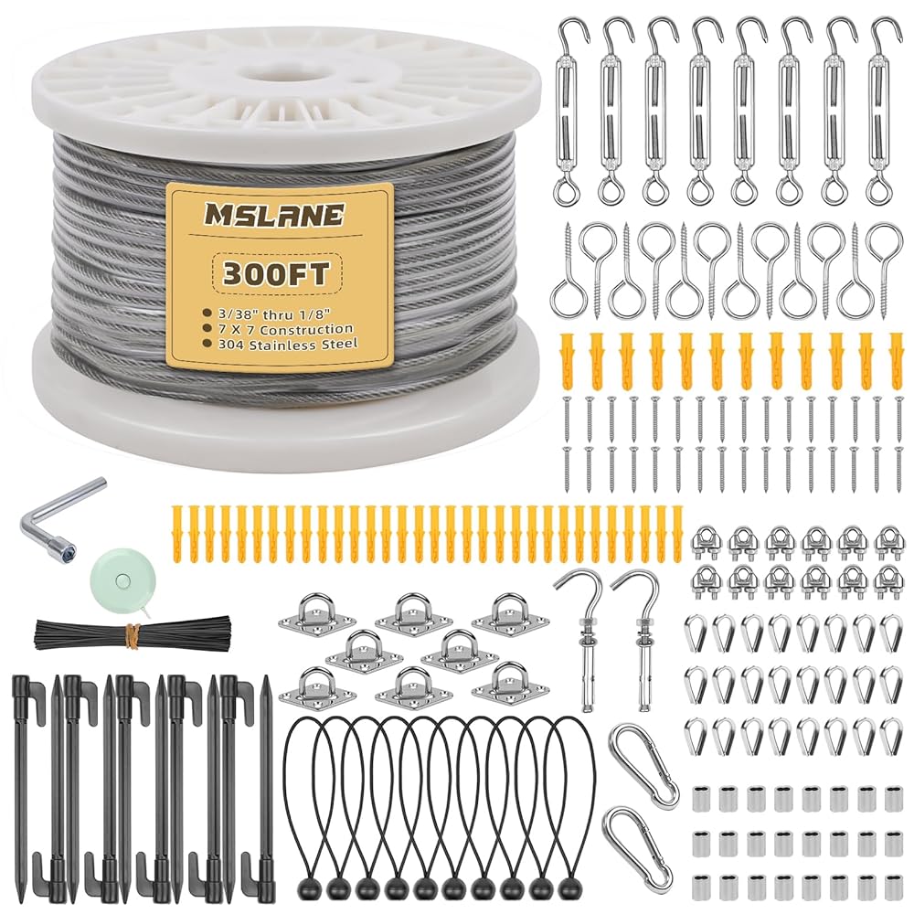 Additional Accessories Available: The steel wire rope kit includes 259 pcs. It saves the extra time spent looking for accessories.Including:300FT wire,8 x M5 turnbuckles,12 x M5 sheep eye screw hooks 65mm,24 x M3 thimbles,24 x M3 aluminum sleeves,12 x M3 wire rope cable clip clamps,2 x carabiner hooks,32 x M5 screws,44 x M5 plastic anchors,2 x M6 expansion hooks,1 x socket wrench,1 x tape measure,10 x tent stakes,100 x black twist ties,10 x bungee balls,8 x M5 pad eyes