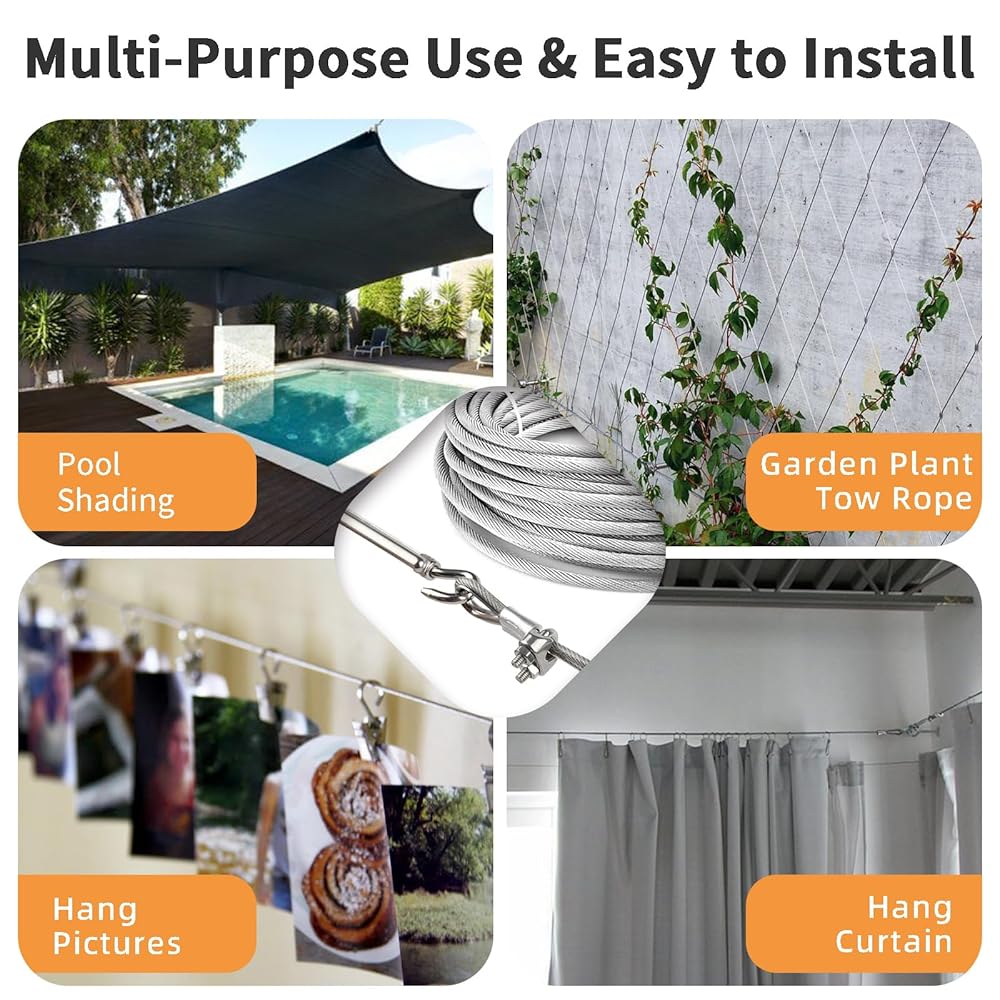 Widely Used: Suitable for outdoor applications, such as outdoor light strings, sunshade sail installation, tent ropes, clotheslines, and trellis wire for climbing plants,garden fences, garden decorative light strips, hanging paintings, patio cable railings, awnings