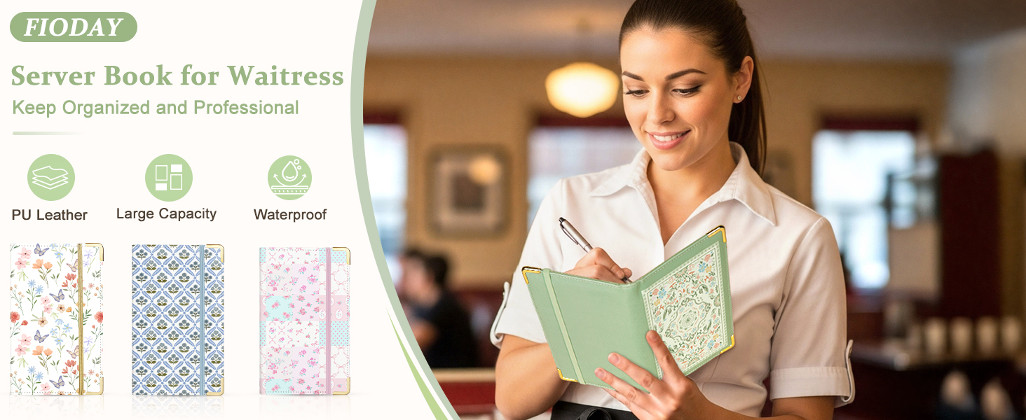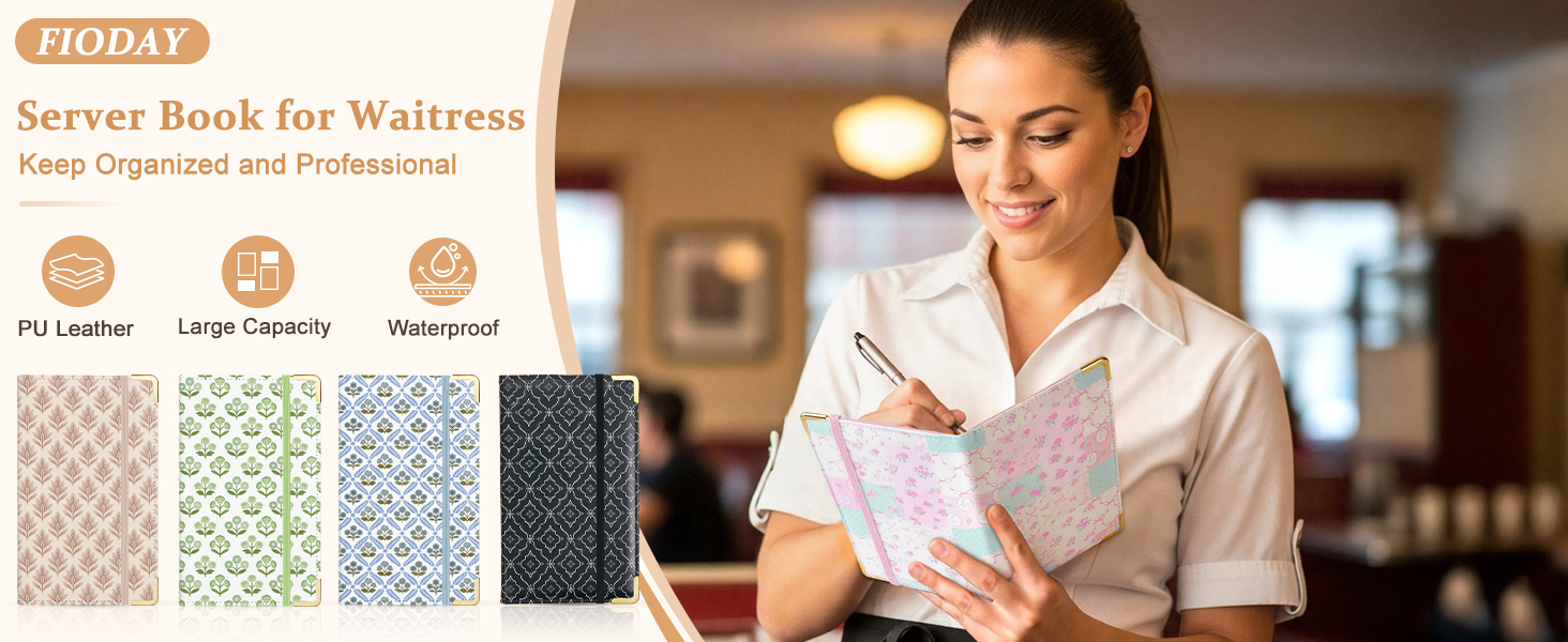 Premium Material: The cute server book is made of premium PU leather, soft in hands; The server book cover is sturdy, waterproof and easy to wipe; The metal coners give the waiter wallet a premium look and make it last longer