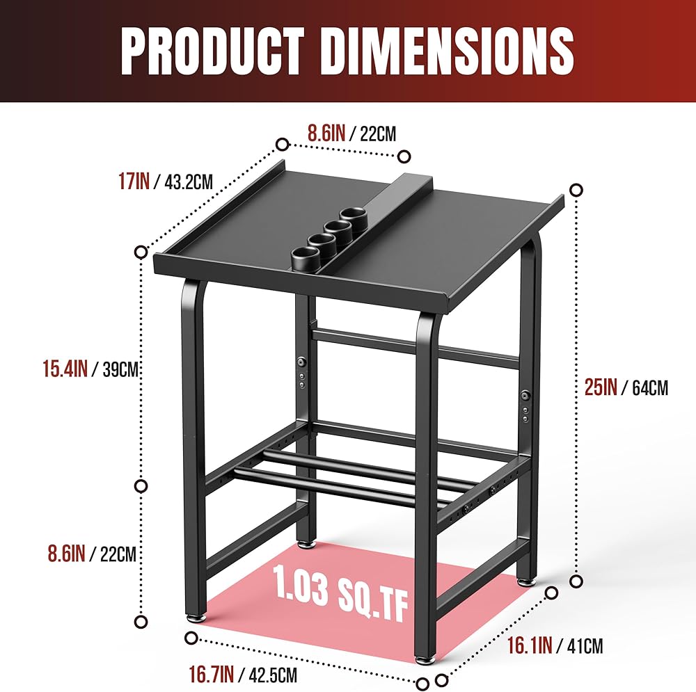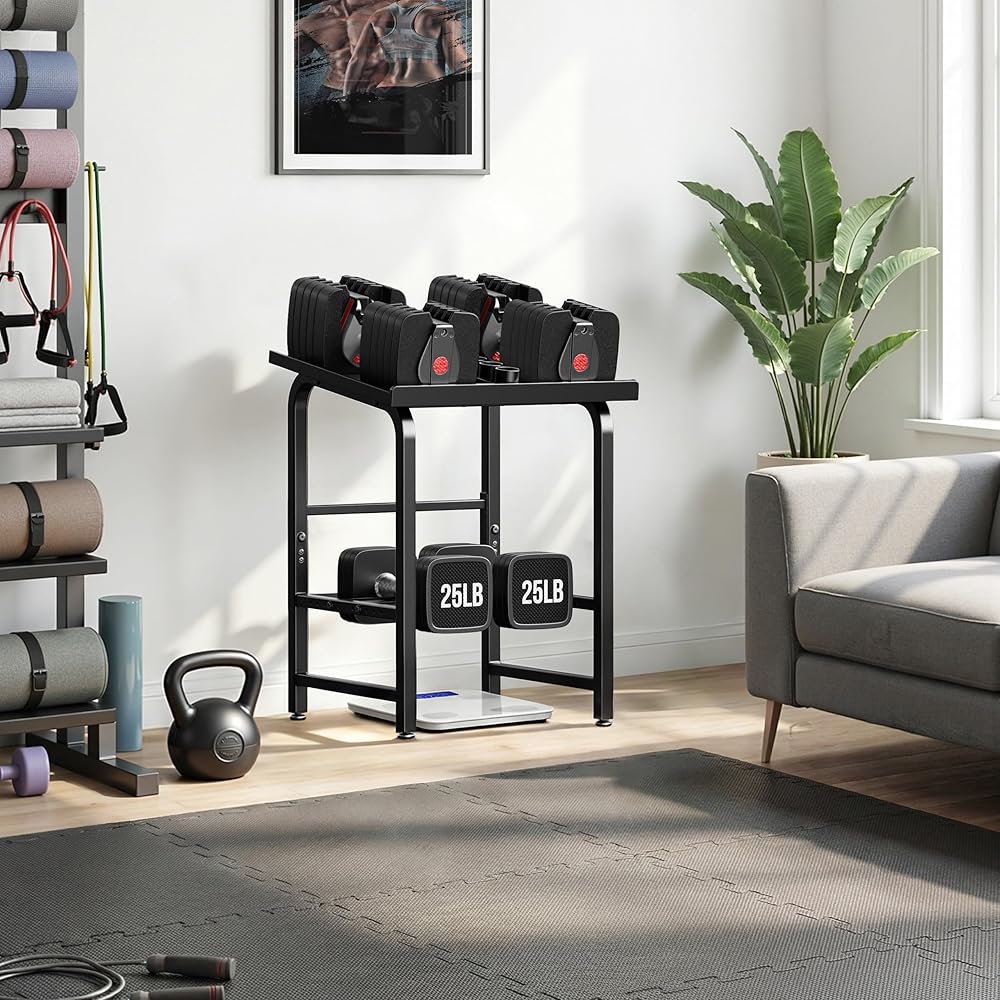 Fits for most adjustable dumbbells – The top platform is designed to hold most adjustable dumbbells (≤17" long, ≤8.6" wide), keeping your weights organized and easy to access.