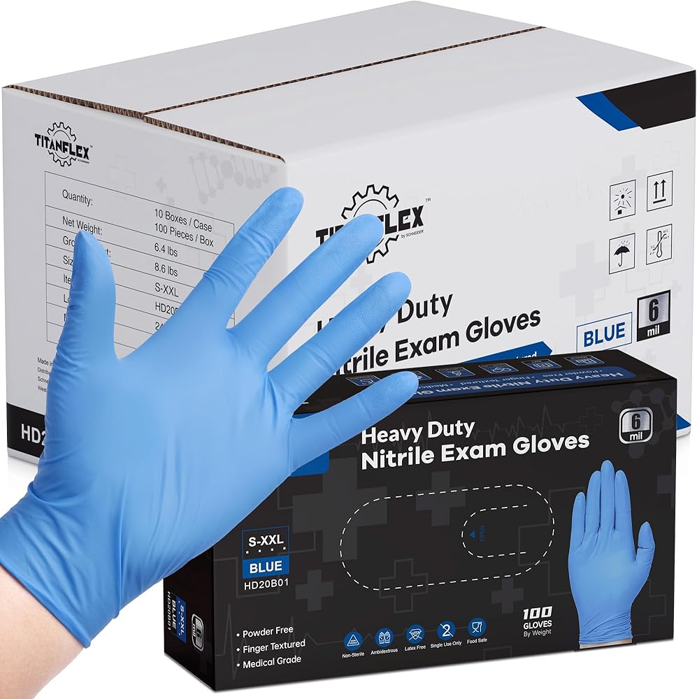 HEAVY DUTY: Our 6-mil thick nitrile disposable gloves are chemical & puncture-resistant, providing a higher level of hand protection against liquids, greases, & sharp objects. The textured finish provides slip resistance in wet or dry conditions.