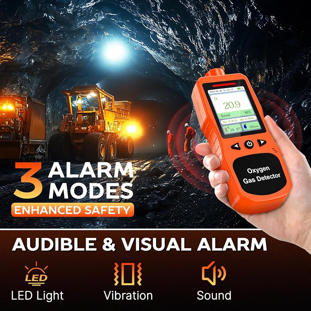 【Triple-Alert Protection】This oxygen meter features a triple-alarm system: sound, light, and vibration that automatically triggers when oxygen levels exceed the default 19.5%-23.5% threshold range, ensuring reliable warnings in all environments and enhanced safety.