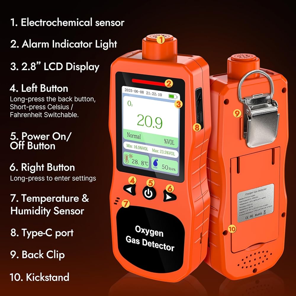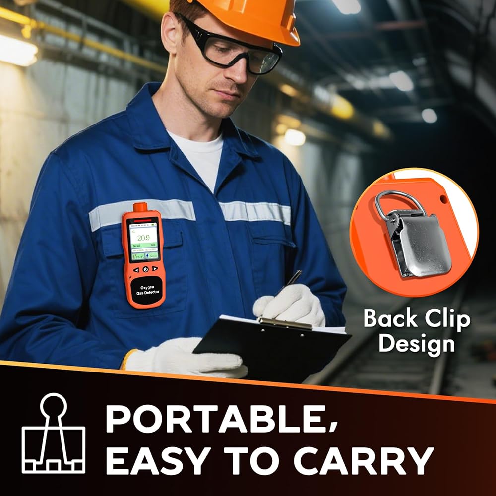 【User-Friendly O2 Meter】The oxygen detector features a 2.8” large LCD screen for clear readability, displaying real-time O2 levels, Max/Min values, ambient temperature (℃/℉), and humidity. Clip-on design allows hands-free operation for worker in industrial and home safety O2 monitoring.