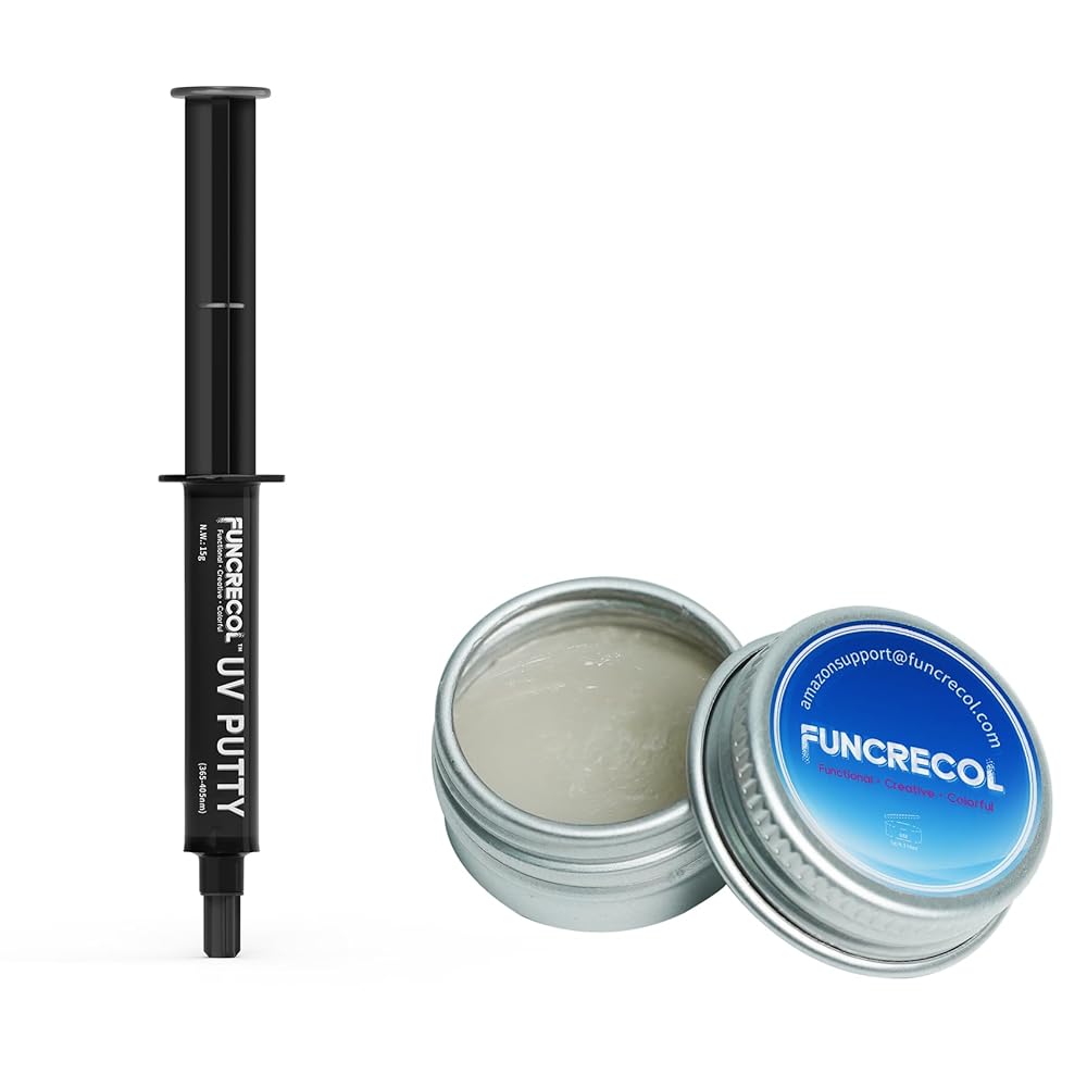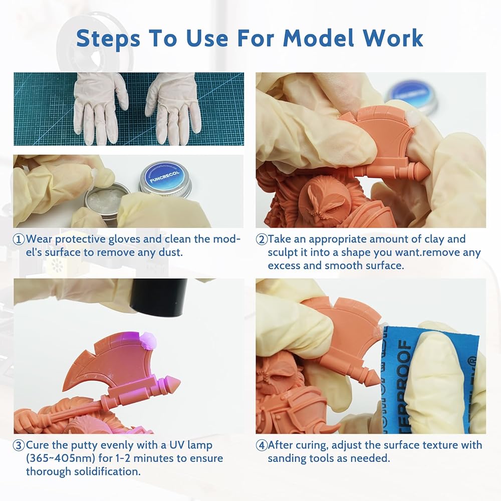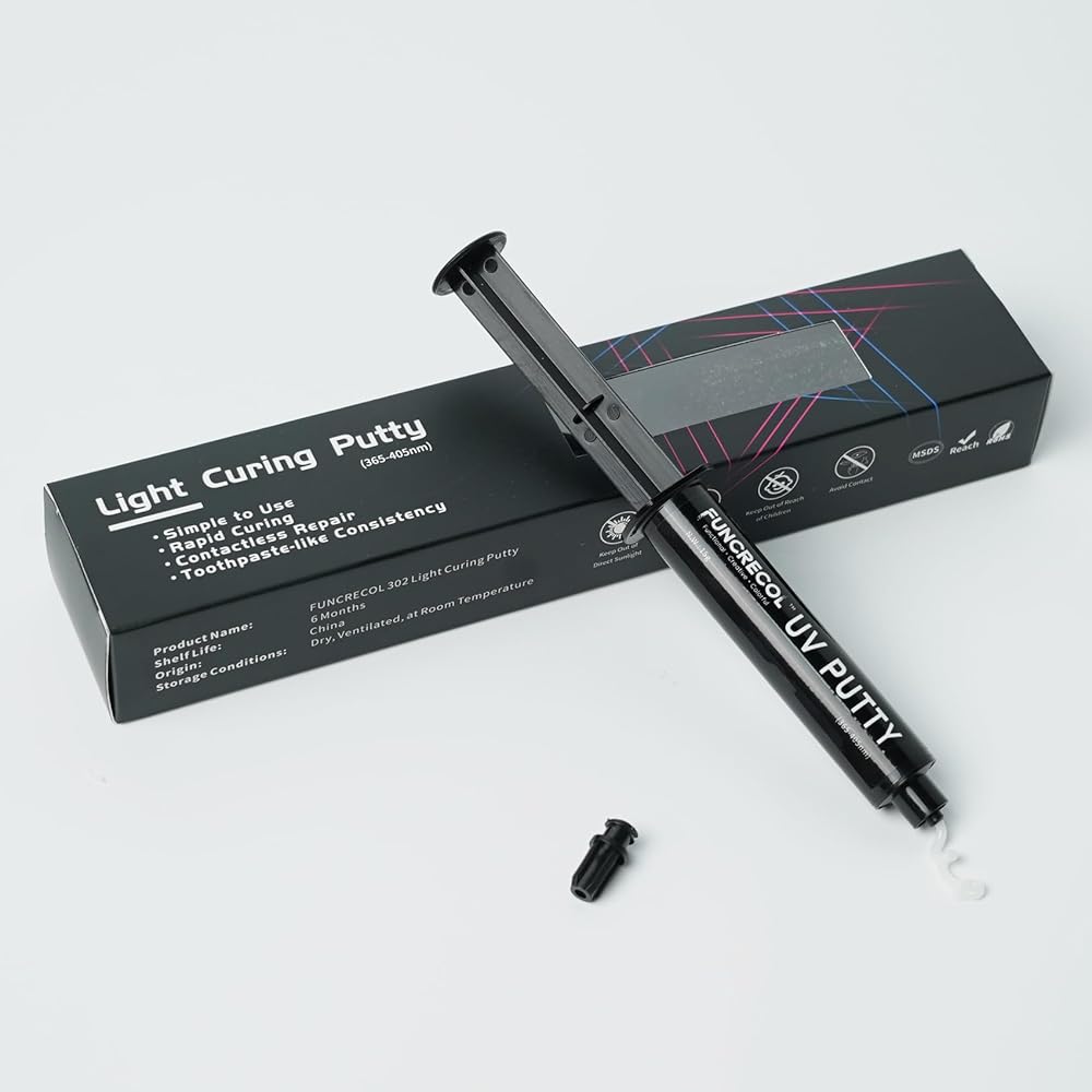FUNCRECOL UV Putty is a clay-like product that can be rapidly cured through UV light. It boasts high hardness, fast curing efficiency, and strong malleability, Works well for model repairs and modifications, It is easy to sand and paint on to perfect your models with speed and precision.