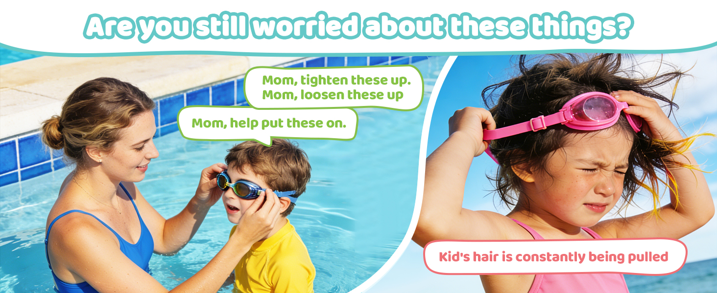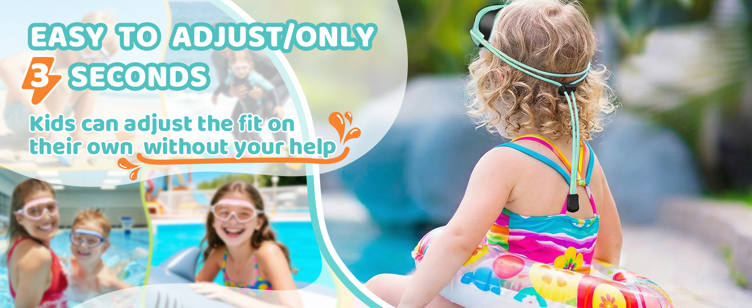 【Say Goodbye to Kids Crying Sessions】Say goodbye to painful hair-pulling! Our innovative elastic bungee strap is 40% wider than traditional silicone straps, providing a snug yet gentle fit. Designed for all-day comfort, it won't tug or tangle kid hair. Whether it's a 5-year-old toddler or a 14-year-old teen, this adjustable kids swim goggles ensures a stress-free swimming experience