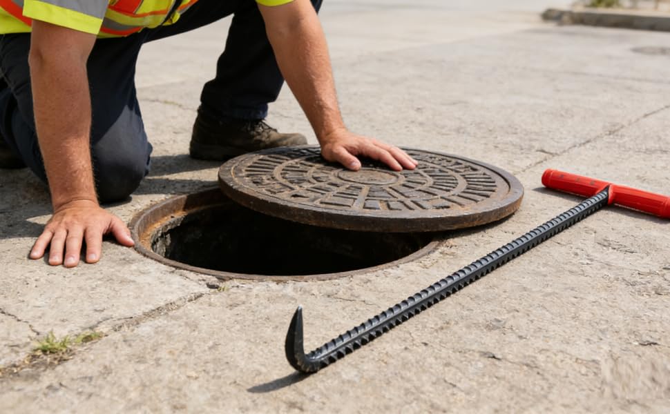 Heavy Duty 26'' (65cm) Long Manhole Hook T Hook Shape Lifting Reaching for Lifting Pulling Moving Manhole Covers, Storm Drains, Septic Tank Lids Door Pointed Head HOOK-PT-65