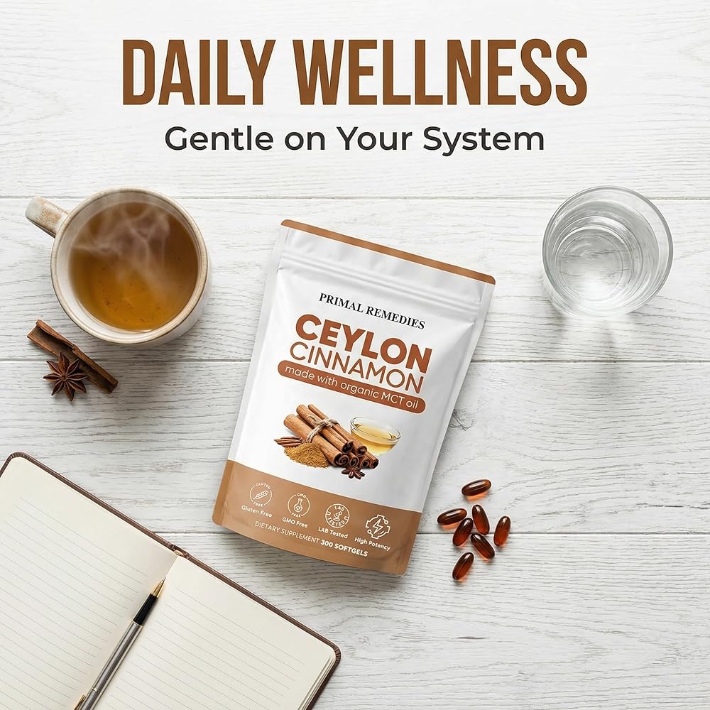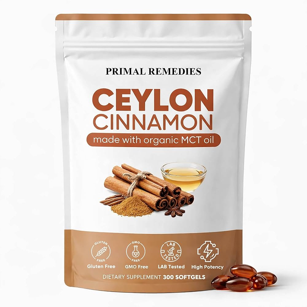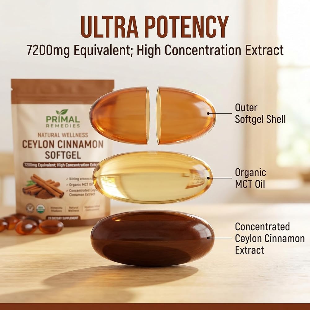 【Primal Remedies Ceylon Cinnamon in Liquid Softgels】: Each serving features authentic Ceylon Cinnamon extract, renowned for its unique properties and considered "true cinnamon." Unlike common Cassia cinnamon, this gentle form is delivered in an easy-to-swallow liquid softgel for superior bioavailability and absorption