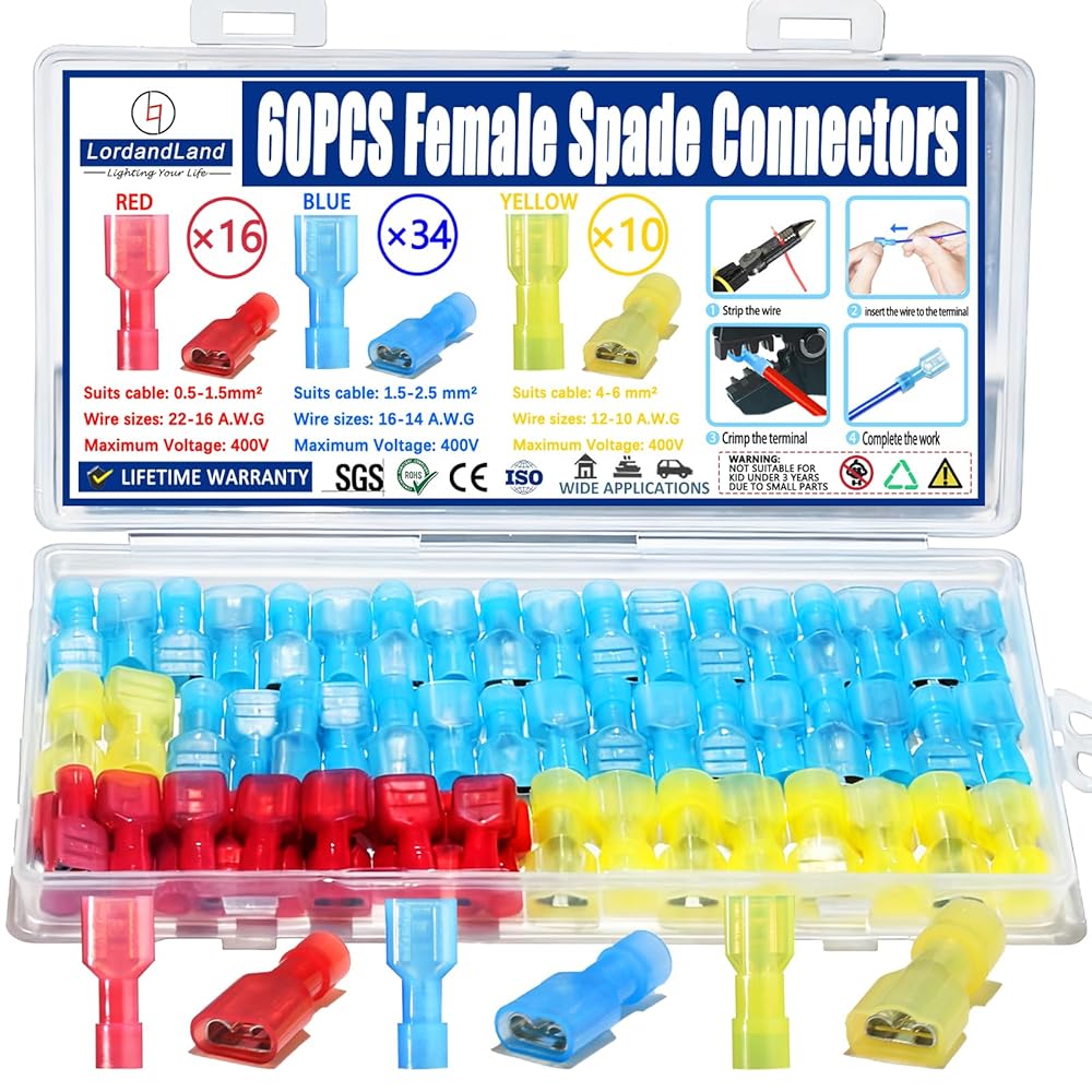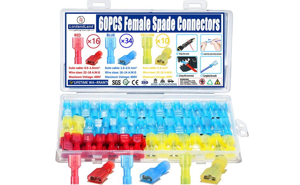 [Package Includes] : The Spade Quick Disconnect Connectors kit includes 22-18AWG/Red 16pcs, 18-14AWG/Blue 34pcs, 12-10AWG/Yellow 10pcs, Total 60pcs packed in a plastic box. If you have any unsatisfactory, please just contact our kindly customer service.