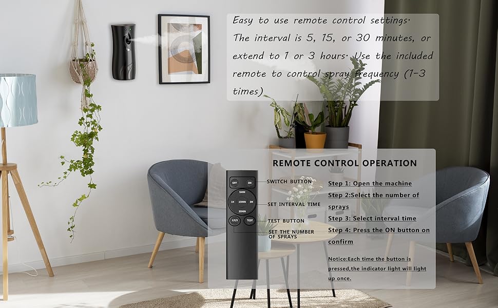 Remote Control & Adjustable Timer Settings – Set your air freshener spray intervals at 5, 15, or 30 minutes, or extend to 1 or 3 hours. Use the included remote to control spray frequency (1–3 times) for a personalized home fragrance system without leaving your seat. (Please note: The time interval between each key press must be greater than 3 seconds, otherwise the settings will not take effect!)