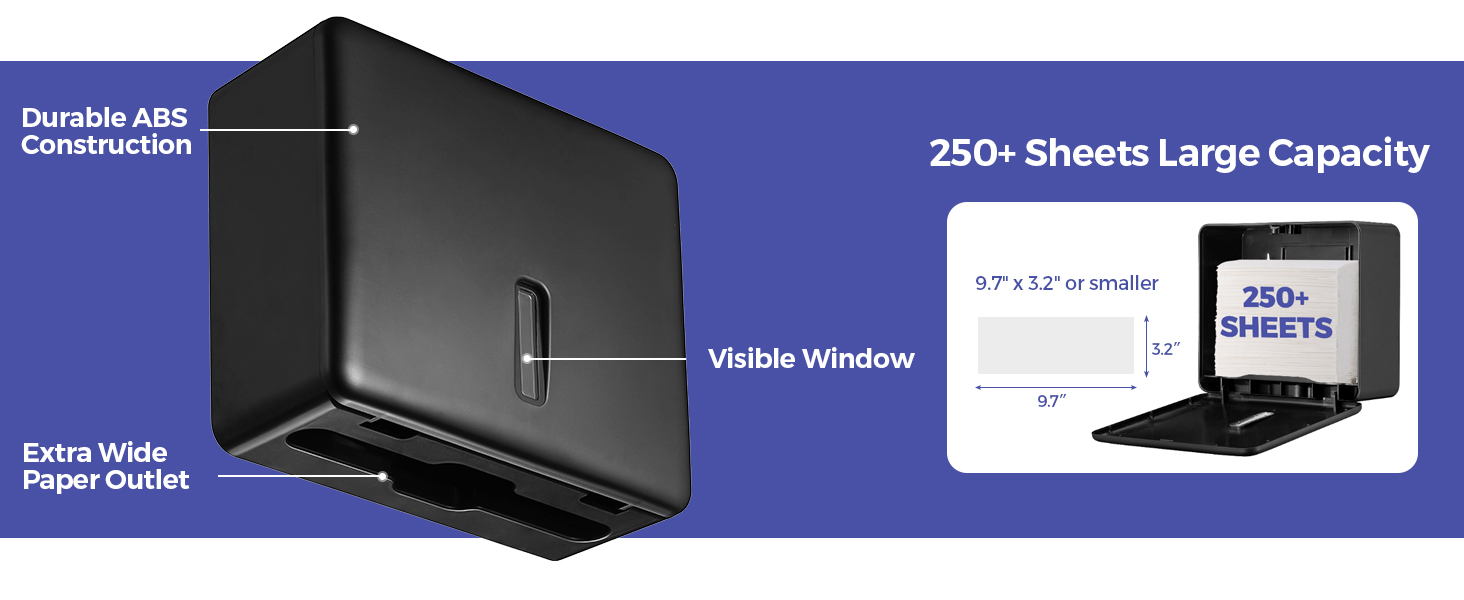 Large Capacity – Holds up to 250+ tri-folded, multi-fold, and C-fold hand paper towels, reducing the need for frequent refills. Features a wide paper outlet for smooth, snag-free dispensing.