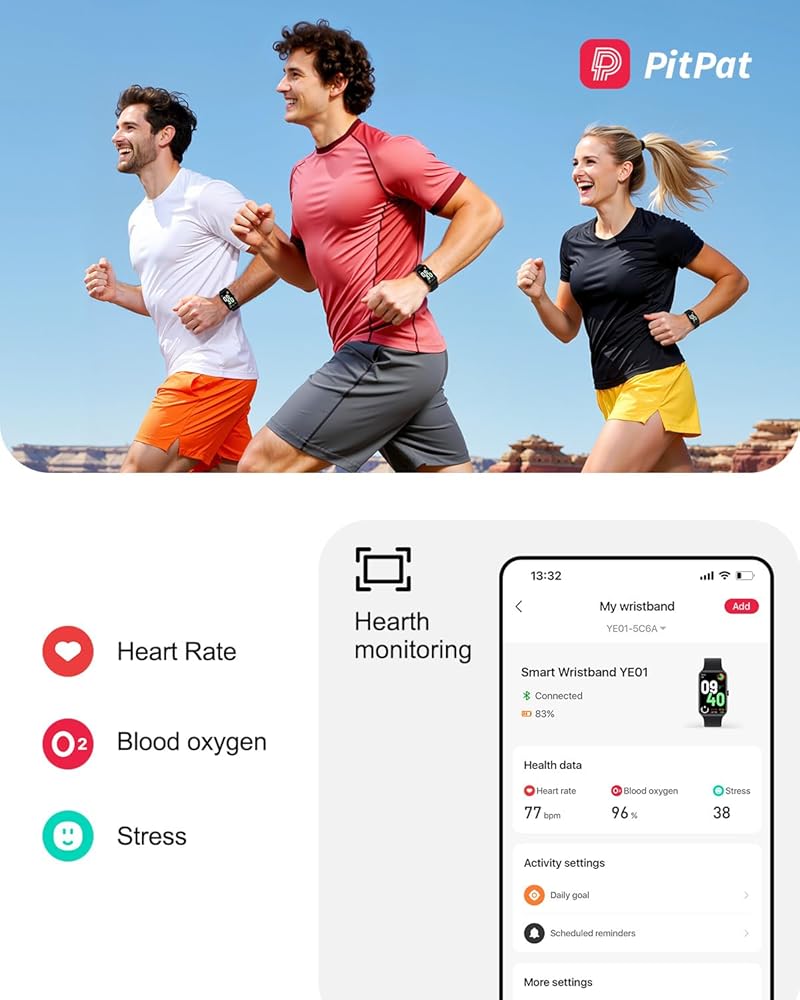 Know Your Body, Reach Your Goals-The PitPat Band tracks essential health data like blood oxygen, stress, heart rate, and sleep. It also monitors your workouts—recording distance, calories, steps, and active time to keep you informed and driven