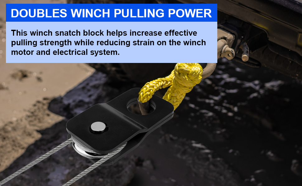 DOUBLES WINCH PULLING POWER – This winch snatch block helps increase effective pulling strength while reducing strain on the winch motor and electrical system.