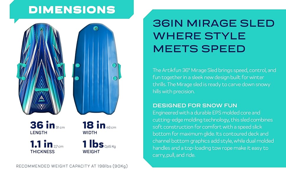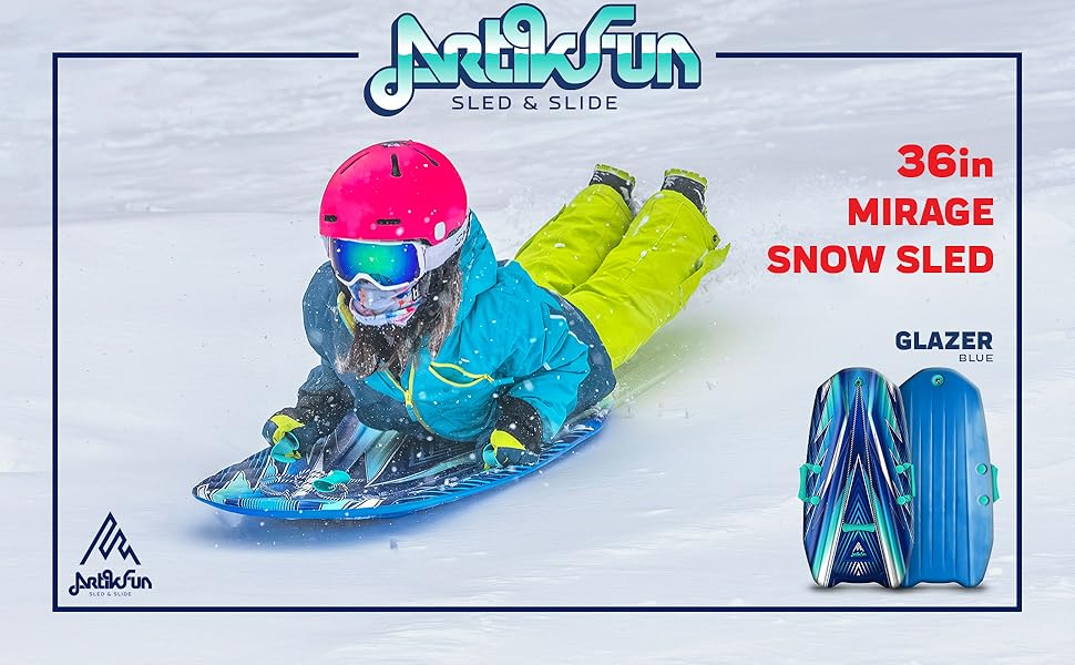 Artikfun designs are created by sport and winter enthusiasts with outdoor fun and enjoyment in mind. Every design is meticulously crafted to embrace fun and enjoyment! Years of extensive manufacturing experience Create a perfect balance of material and performance all within one sled. Let Artikfun sled inspire a day of fun on the snow while promoting a new healthy lifestyle. Each sled is crafted from rigid foam construction that creates a thrilling yet safer ride for enthusiasts of all ages. The ArtikFun 36in Mirage Foam Snow Sled is designed for fast, fun rides down snowy hills. Featuring a bold new design with a contoured top and a slick bottom, this lightweight sled delivers both performance and style. Built with a durable EPS molded core and soft construction, it combines strength with comfort for smooth gliding on snow. The molded handles offer a secure grip, while the top-loading tow rope makes it easy to pull back uphill. With its hybrid slick channel bottom and crescent tail, the Artikfun Mirage sled ensures stability, control, and speed for endless winter fun.