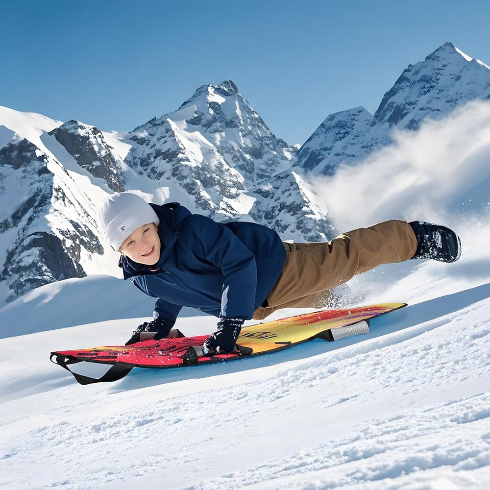 ️𝗕𝗔𝗟𝗔𝗡𝗖𝗘 𝗔𝗡𝗗 𝗖𝗢𝗡𝗧𝗥𝗢𝗟 𝗔𝗧 𝗬𝗢𝗨𝗥 𝗙𝗘𝗘𝗧: Take charge of your sledding adventure with our sled's two built-in feet slits. The sleek, polished underside of our sled ensures a seamless, rapid glid,Whether you're tackling steep slopes or gliding through gentle drifts, they provide ultimate balance and control, ensuring a stable and thrilling ride. Embrace the excitement of the snow with our Unique Snow Sled!