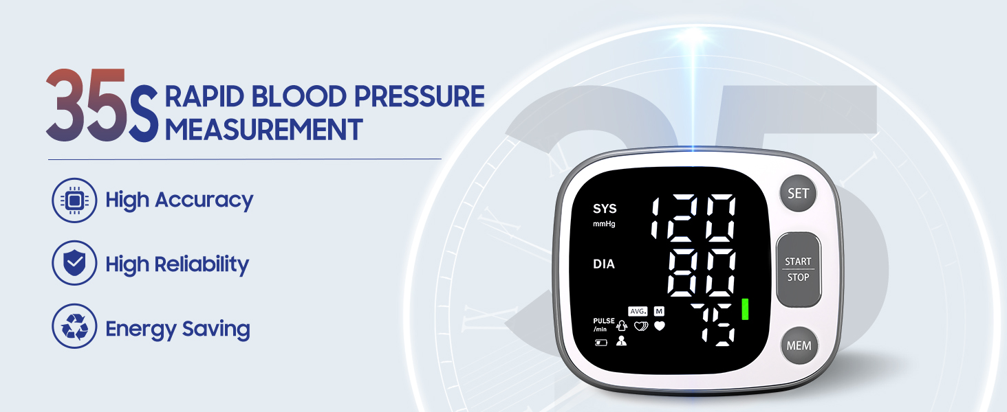 Fast and Accurate Measurements: Our fully automatic wrist blood pressure machine provides fast and precise results, simply press the "START/STOP" button, and the measurement process takes 35 seconds; the device automatically turns off after 60 seconds of inactivity