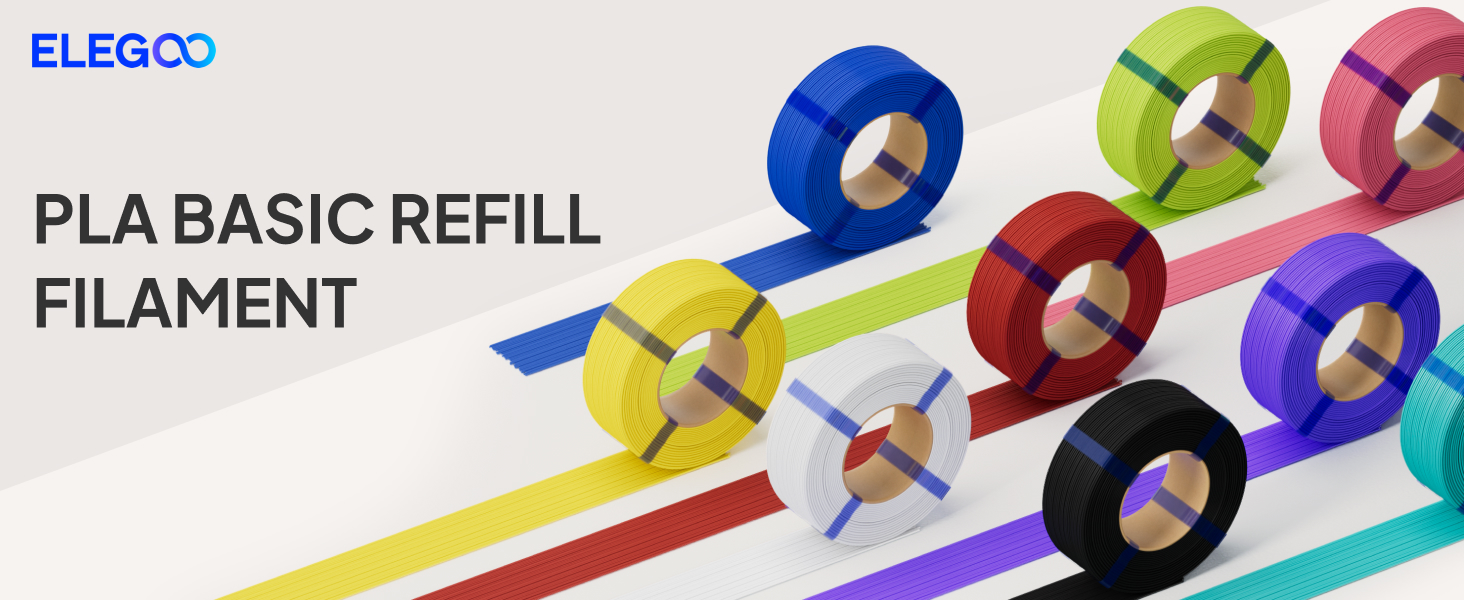 REDUCE WASTE WITH REFILL DESIGN - ELEGOO PLA Basic Refill offers a more sustainable alternative to traditional spooled filament. By eliminating the need of spools, minimizes plastic waste and lowers carbon footprint, allowing you to enjoy high-quality printing while reducing environmental impact