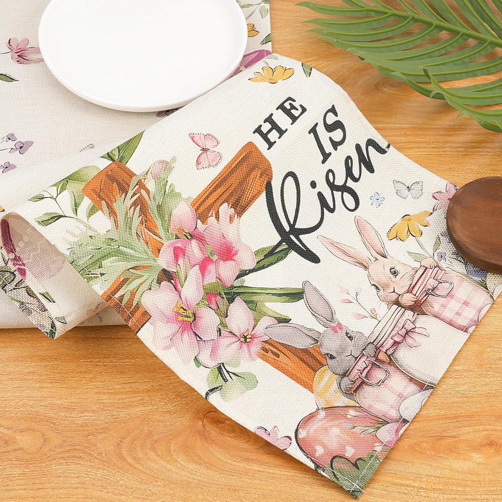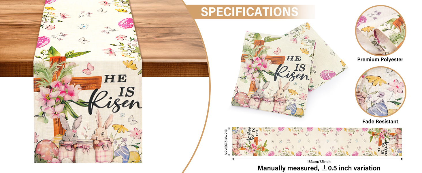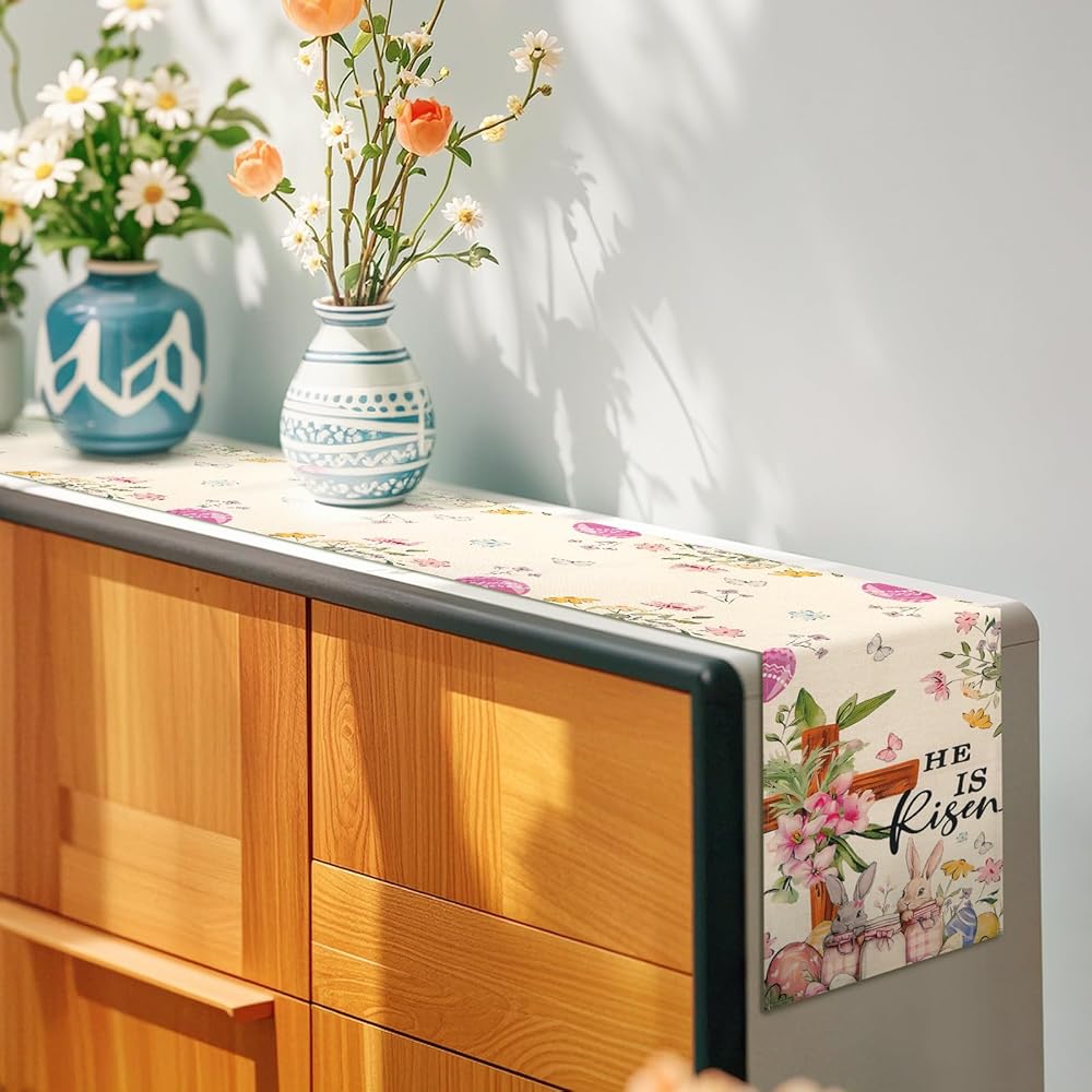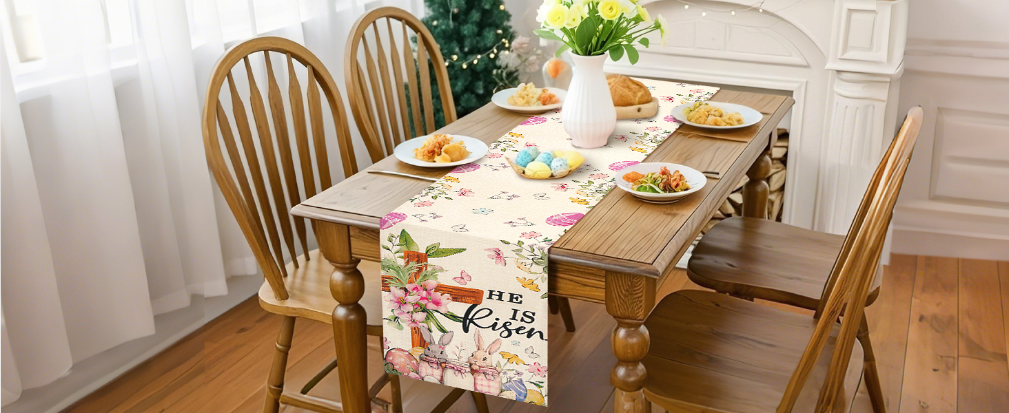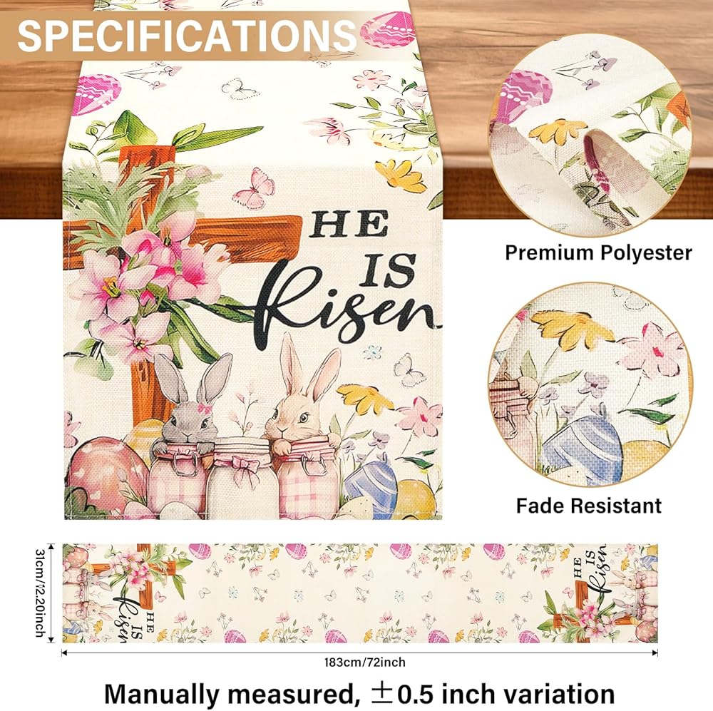 Easter Table Runner: Featuring vibrant Easter bunnies, Easter eggs, Flowers & "He is Risen”, this Easter table runner transforms your dining table into a blooming garden. Perfect for Easter table decorations, spring parties, and seasonal home decor