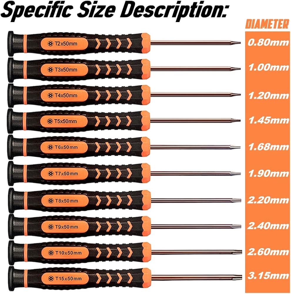 T2, T3, T4, T5, T6, T8, T9, T10, T15 Torx Screwdrivers (each 1pc)