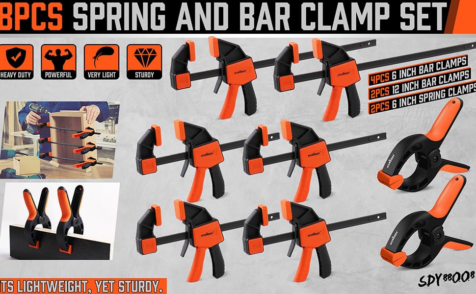 1. The complete set includes 4pcs 6" bar clamps,2pcs 12" bar clamps and 2pcs 6" spring clamps, which can meet different needs.