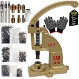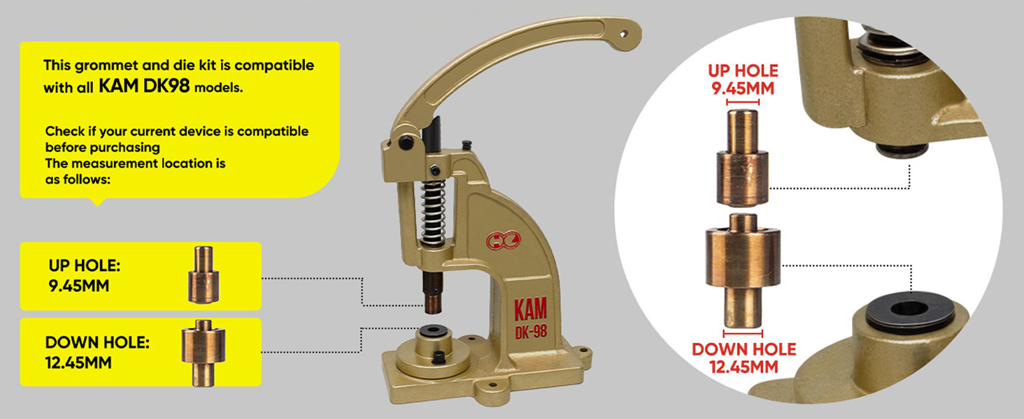 [Upgraded Version]-------The new design grommet machine solves: 1-The old hand press machine breaks (Iron materials changed into high-density alloy,Hollow inner structure replaced with solid) More durable 2-Incorrect upper and lower die set alignment (Added a lower mold fixer) 3-Eyelet burst (Increased material thickness) 4-Ergonomically designed pressure arm for greater using