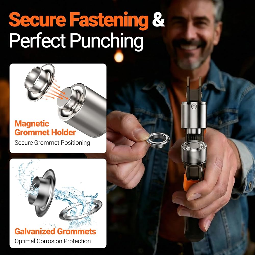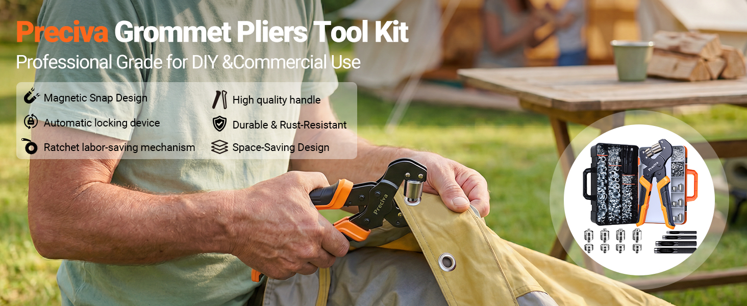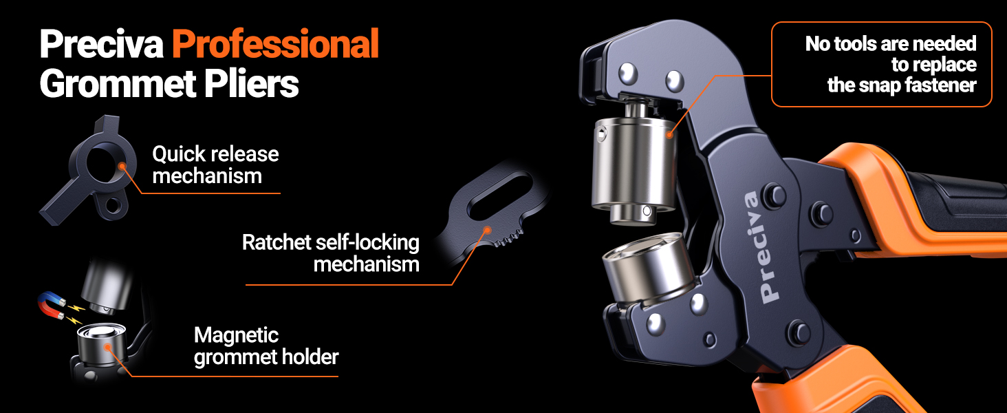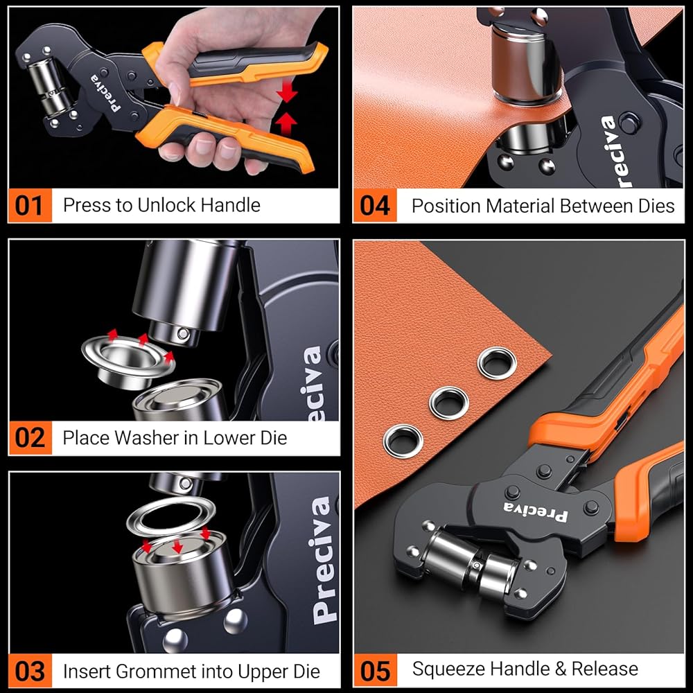 Labor-Saving Ratchet Design: The grommet tool comes with a ratchet device that reduces the pressure needed to be applied for stamping, saving more labor than ordinary grommet pliers.