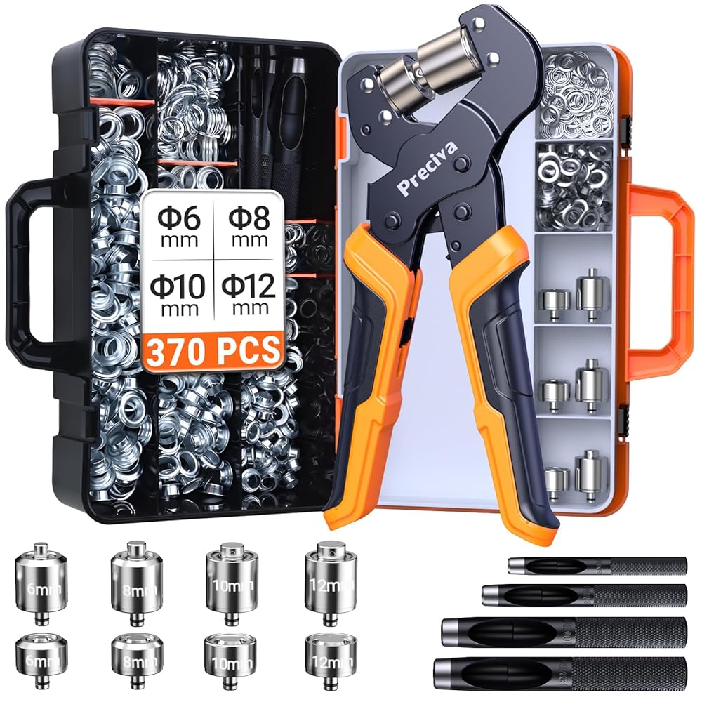 Portable Grommet Kit: Complete tool set includes 1 double-layer portable storage case for easy carrying and organization, 1 4-size grommet pliers, 370Pcs rust-resistant grommets and 4 hole puncher (1/2" 1/4" 5/16" 3/8").