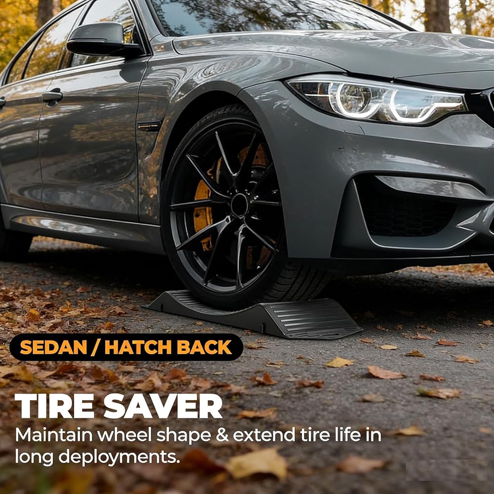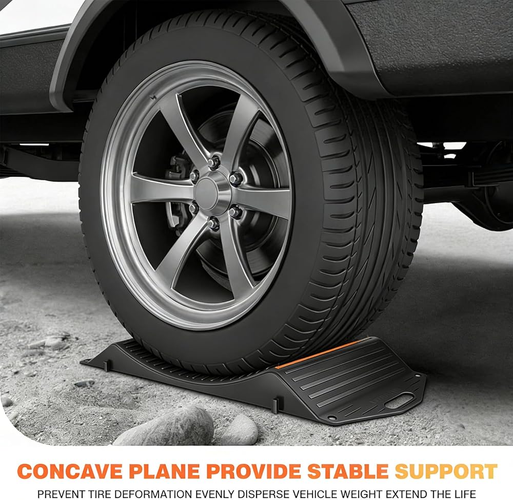 SECURE STABILITY AND FLOOR PROTECTION: Acts as a precise vehicle stopper to guide parking in tight garage spaces. By elevating tires off cold concrete floors, these ramps also prevent moisture damage and corrosion, extending the lifespan of your valuable tires