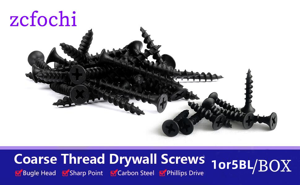 The Drywall Screws by the zcfochi Screws Company are made from high-quality steel for superior strength, with black phosphate coating, which has higher corrosion resistance and rust prevention effect, longer service life and less damage, have a sharp point tip for an instant bite and starting drive.