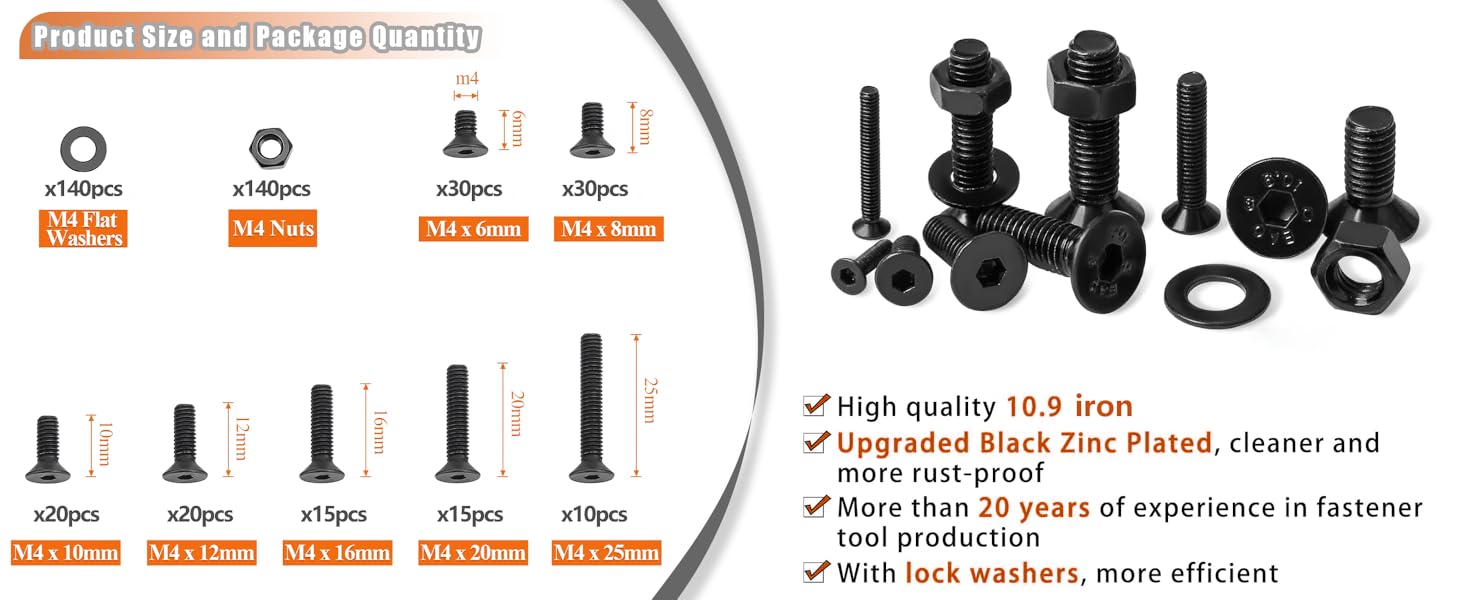 【Organized & Practical】 420 pieces in total, organized by size in a clear, durable box with labels. Select the right m4 screws quickly and efficiently. This all-in-one kit includes hex bolts, black socket head screws, along with washers, a wrench, and tweezers.