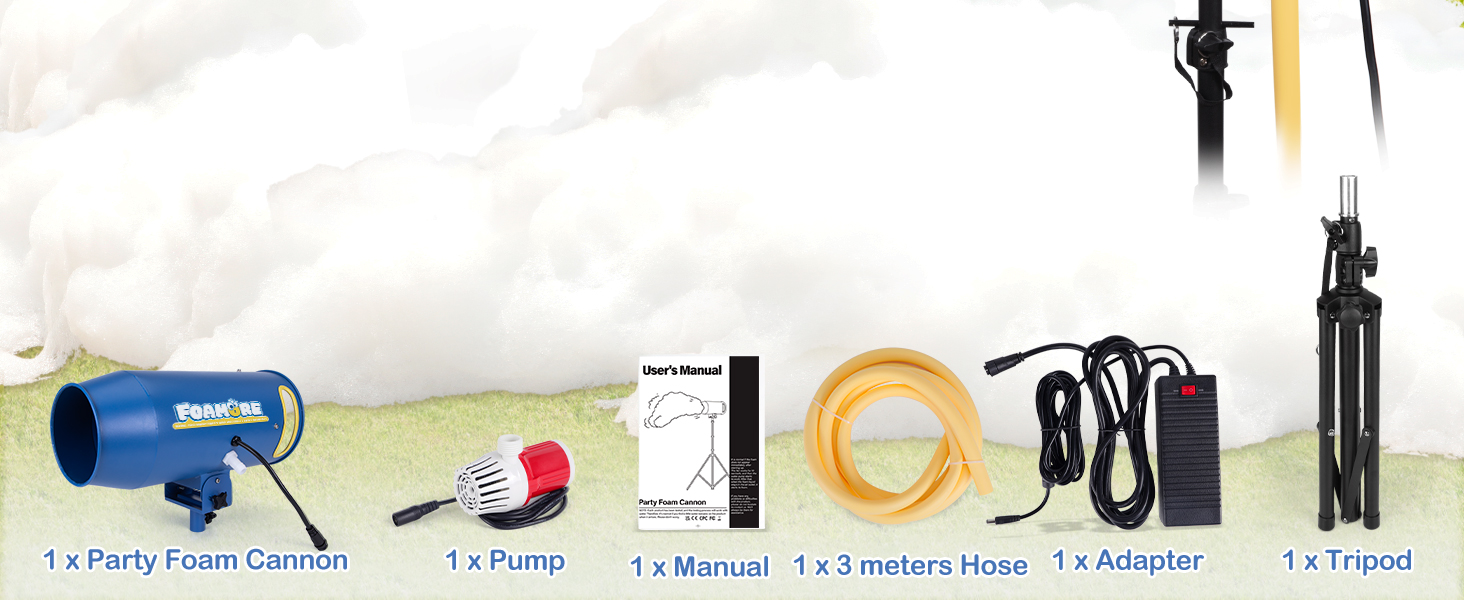 Portable and Easy to Install - The package includes 1 x party foam cannon, 1 x pump, 1 x adapter, 1 x 3 meters hose, and 1 x tripod, just need 6 steps to install within 3 mins. Please watch the video on the product page to install the foam machine.