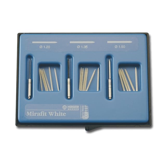 Mirafit White Fiberglass Post Introductory Kit. Kit contains: 18 posts and 3 reamers. Mirafit White Fiberglass Posts are thread-free reconstruction posts made of carbon fiber. Physical properties of the post are similar to those of dentin and reconstruction composite.