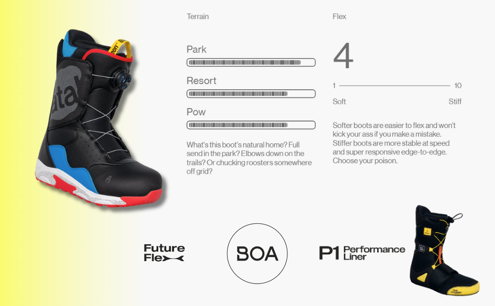BOA: Improve your snowboarding experience with the ultimate in fit and convenience. Featuring the innovative BOA Fit System, Bataleon boots offer effortless adjustments for a perfect fit every time. The micro-adjustable dial allows for precise tightening or loosening, ensuring maximum control and stability on the slopes. The BOA system includes a lifetime warranty.