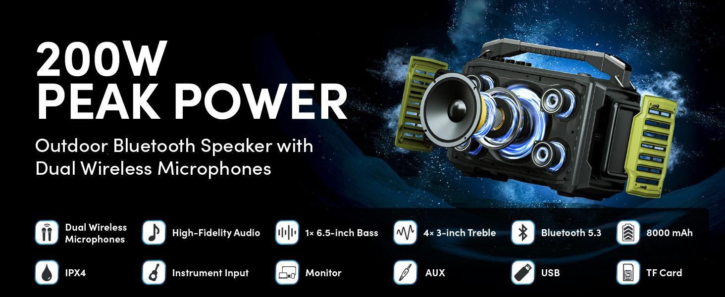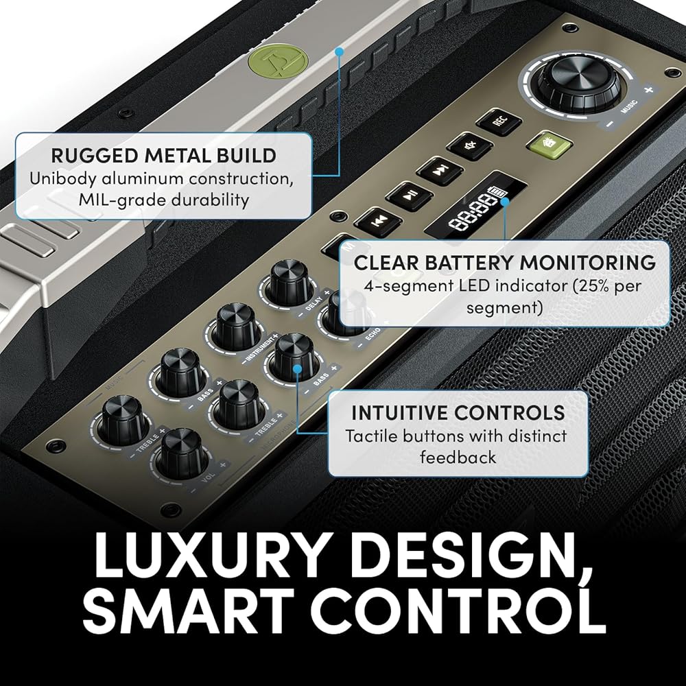 200W Professional Voice Amplification & Karaoke in One: Engineered for professional-grade sound, our military-grade aluminum unibody construction delivers crystal-clear 200W output with 9+ hours of continuous playtime (8000mAh battery). Featuring intuitive tactile controls and a 4-LED power indicator, this rugged yet luxurious sound machine perfectly optimized for both crystal-clear voice projection in classrooms and powerful vocal performance for karaoke.