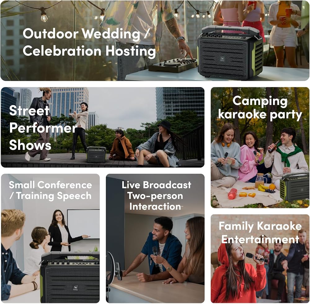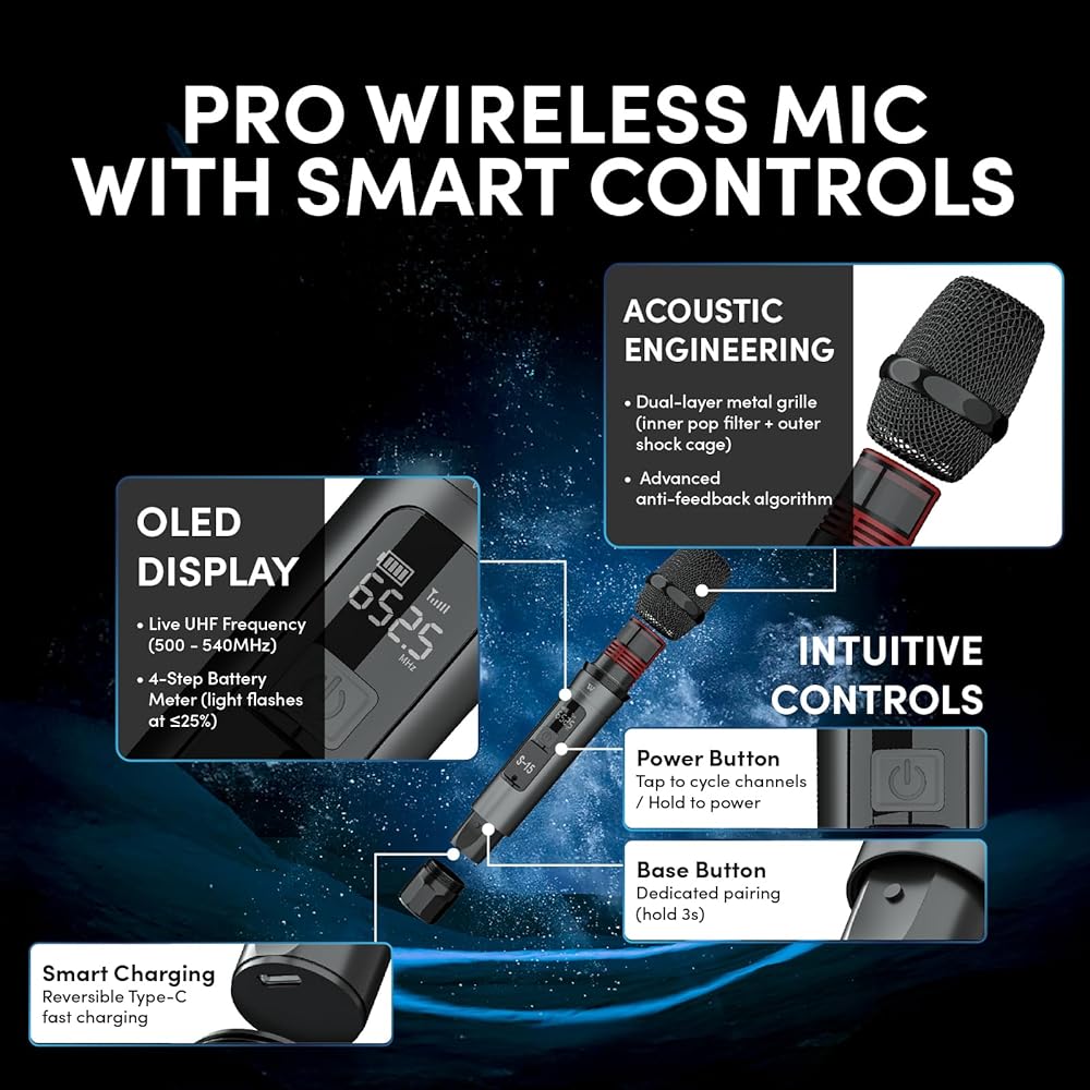 Dual Professional Wireless Microphones: Includes 2 premium UHF wireless handheld mics featuring industry-first auto-pairing with speakers, OLED displays, and ultra-fast Type-C charging (1800mAh battery, 13+ hour runtime).Delivers studio-quality vocal clarity for professional performances, karaoke,outdoor events and public speaking.